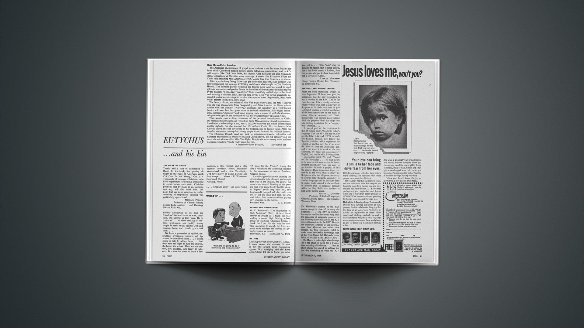 Thanks and a vote of admiration to David E. Kucharsky for putting his finger on the pulse of American youth (“A Case for the Young,” Oct. 11). Thousands of younger Christians, who have experienced something amounting to consternation over older Christian positions held by many in an inconsistant way, will also thank him. The point that age is no criterion for either creativity or responsible thinking was particularly appreciated.