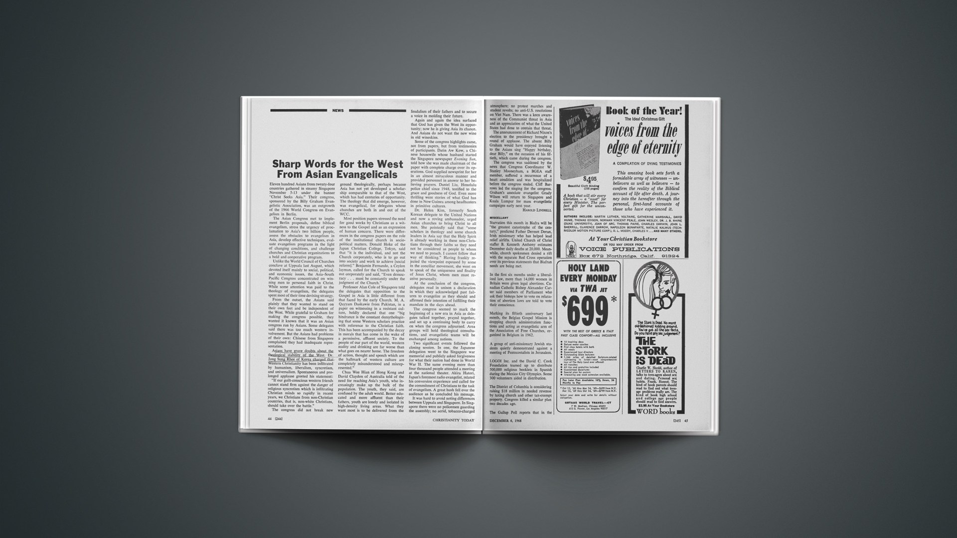Eleven hundred Asians from twenty-four countries gathered in steamy Singapore November 5–13 under the banner “Christ Seeks Asia.” Their congress, sponsored by the Billy Graham Evangelistic Association, was an outgrowth of the 1966 World Congress on Evangelism in Berlin.