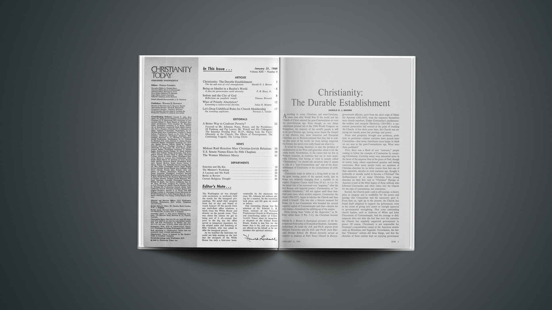 One interesting change was the selection of Dr. Edward L. R. Elson, minister of the National Presbyterian Church in Washington and contributing editor of CHRISTIANITY TODAY since its inception, as chaplain of the United States Senate. Kudos is due him for the honor that is his, and our prayers are offered on his behalf as he undertakes this spiritual ministry.