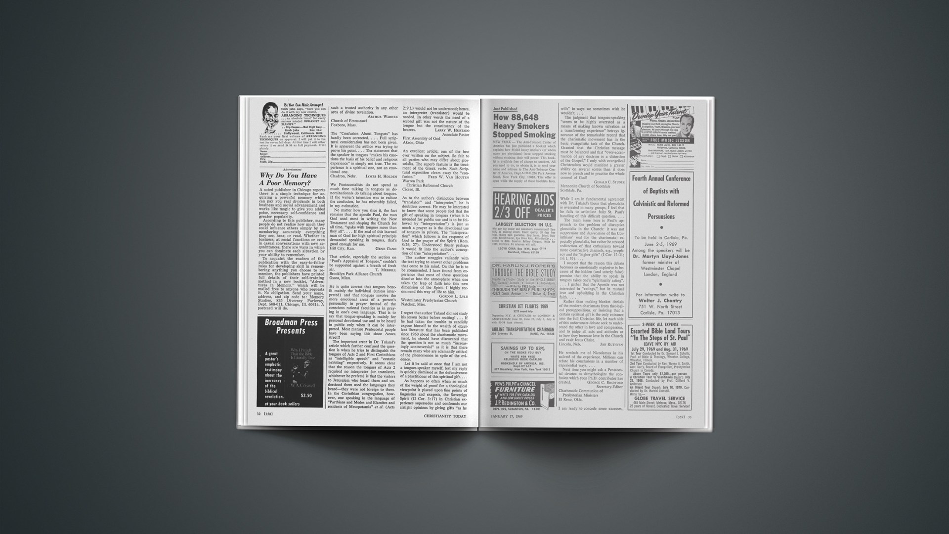 I regretfully “take pen in hand” to protest against the article on “tongues.” The Pentecostal—otherwise known as charismatic—movement has been by many hailed as the third great force in Christianity, and to dismiss it in the cavalier manner of that article is deplorable and unworthy of the high standards of your magazine.
