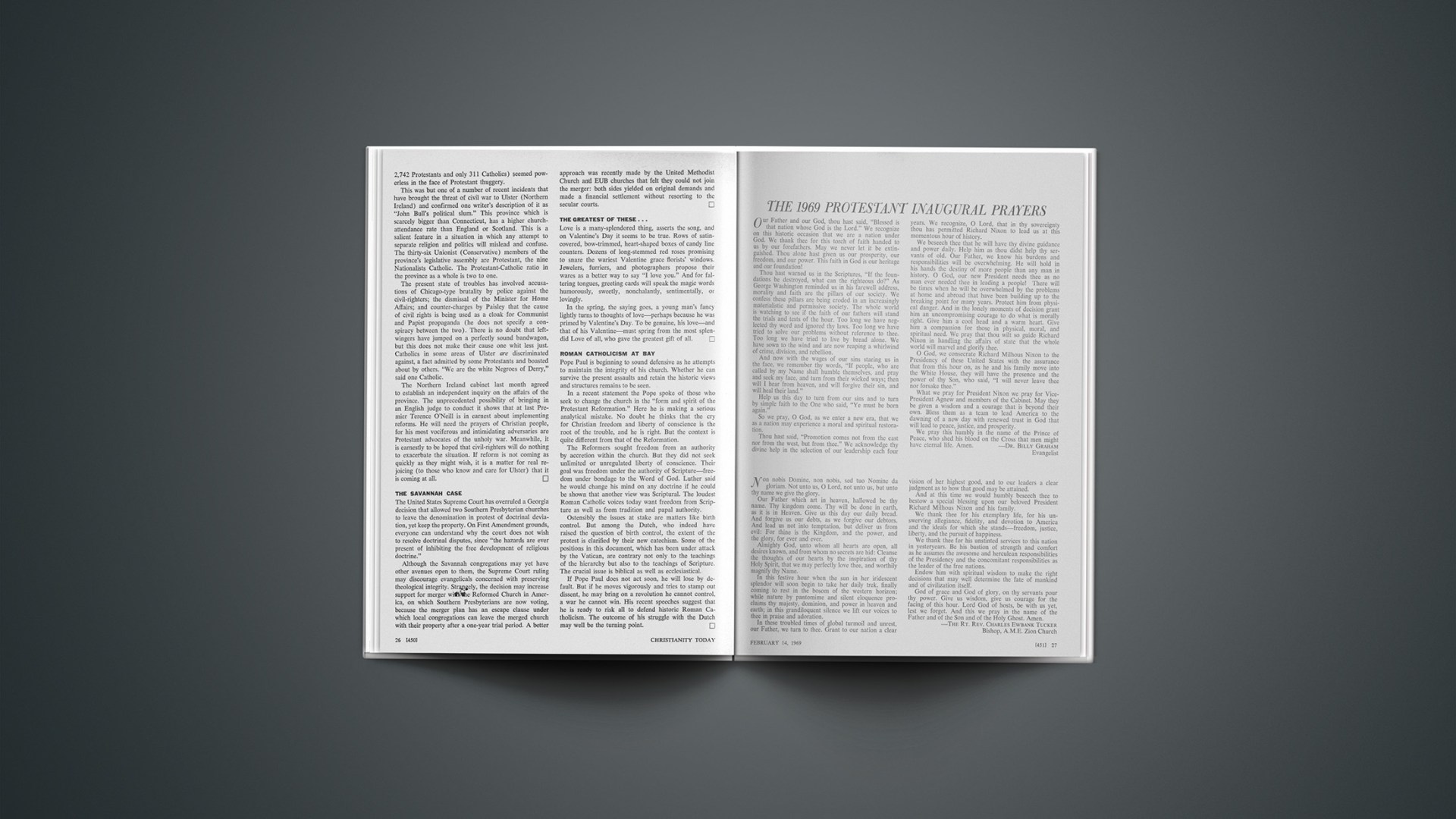 We beseech thee that he will have thy divine guidance and power daily. Help him as thou didst help thy servants of old. Our Father, we know his burdens and responsibilities will be overwhelming. He will hold in his hands the destiny of more people than any man in history. O God, our new President needs thee as no man ever needed thee in leading a people! There will be times when he will be overwhelmed by the problems at home and abroad that have been building up to the breaking point for many years. Protect him from physical danger. And in the lonely moments of decision grant him an uncompromising courage to do what is morally right. Give him a cool head and a warm heart. Give him a compassion for those in physical, moral, and spiritual need. We pray that thou wilt so guide Richard Nixon in handling the affairs of state that the whole world will marvel and glorify thee.
