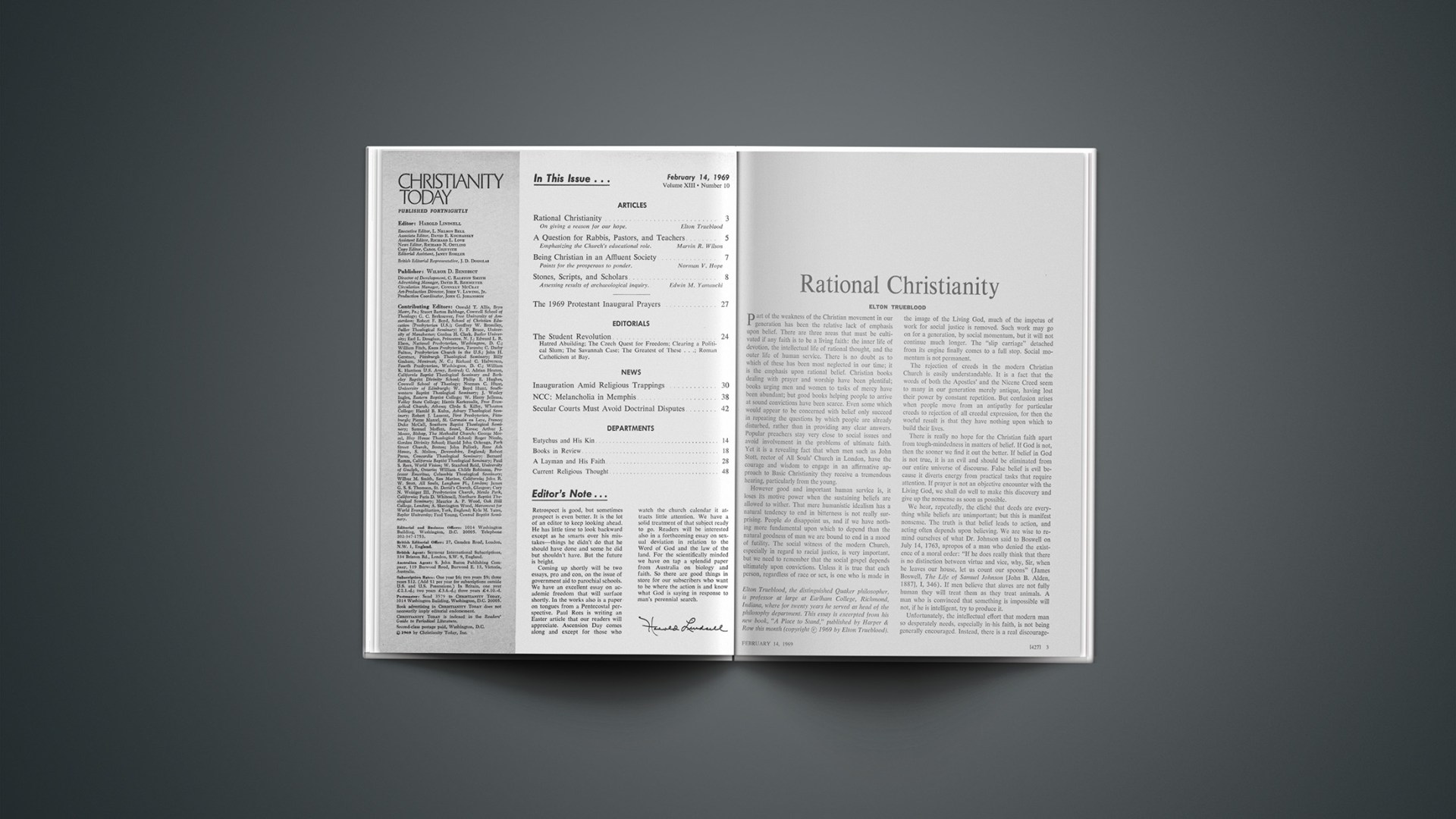 Coming up shortly will be two essays, pro and con, on the issue of government aid to parochial schools. We have an excellent essay on academic freedom that will surface shortly. In the works also is a paper on tongues from a Pentecostal perspective. Paul Rees is writing an Easter article that our readers will appreciate. Ascension Day comes along and except for those who watch the church calendar it attracts little attention. We have a solid treatment of that subject ready to go. Readers will be interested also in a forthcoming essay on sexual deviation in relation to the Word of God and the law of the land. For the scientifically minded we have on tap a splendid paper from Australia on biology and faith. So there are good things in store for our subscribers who want to be where the action is and know what God is saying in response to man’s perennial search.