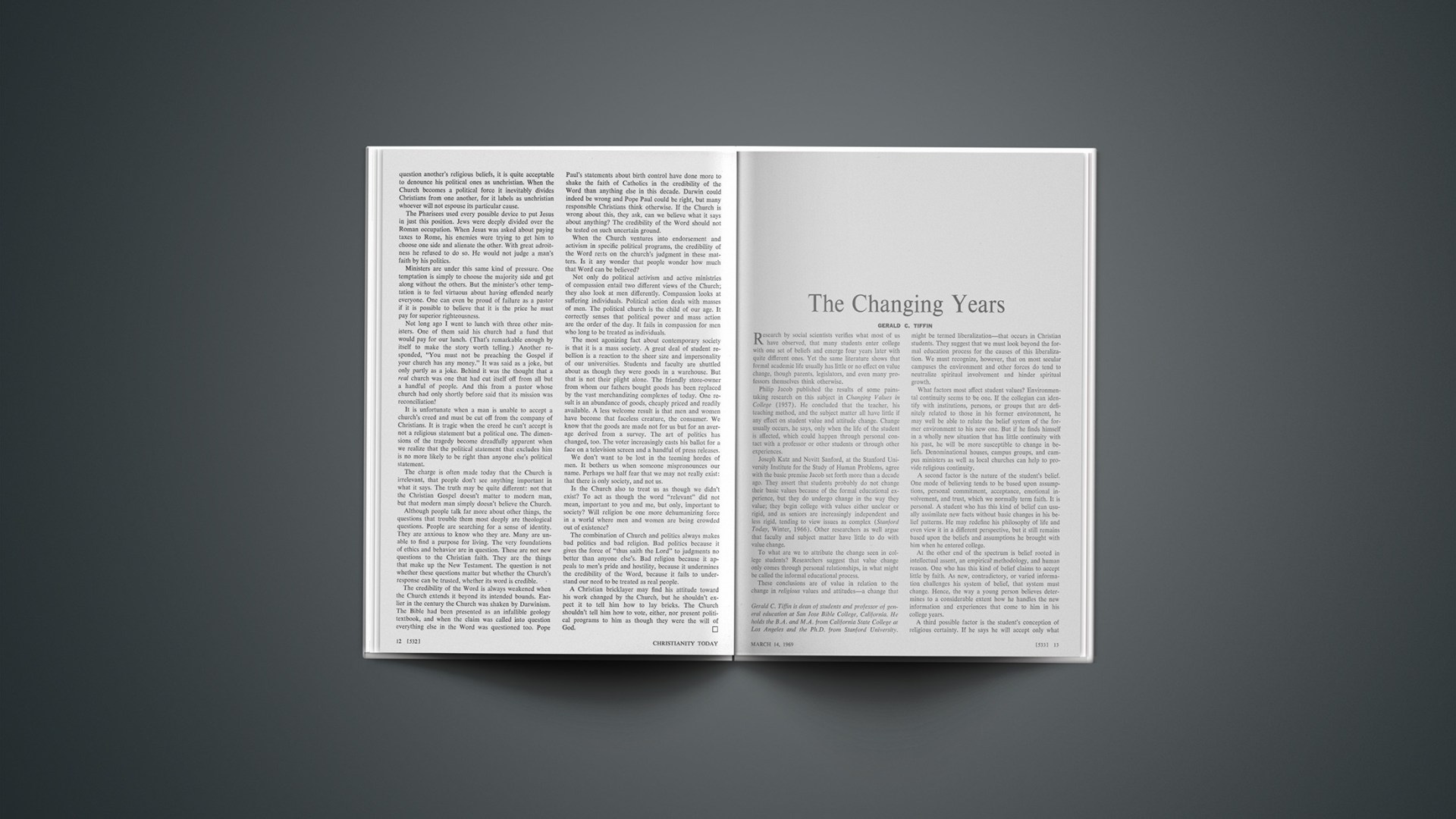 These conclusions are of value in relation to the change in religious values and attitudes—a change that might be termed liberalization—that occurs in Christian students. They suggest that we must look beyond the formal education process for the causes of this liberalization. We must recognize, however, that on most secular campuses the environment and other forces do tend to neutralize spiritual involvement and hinder spiritual growth.