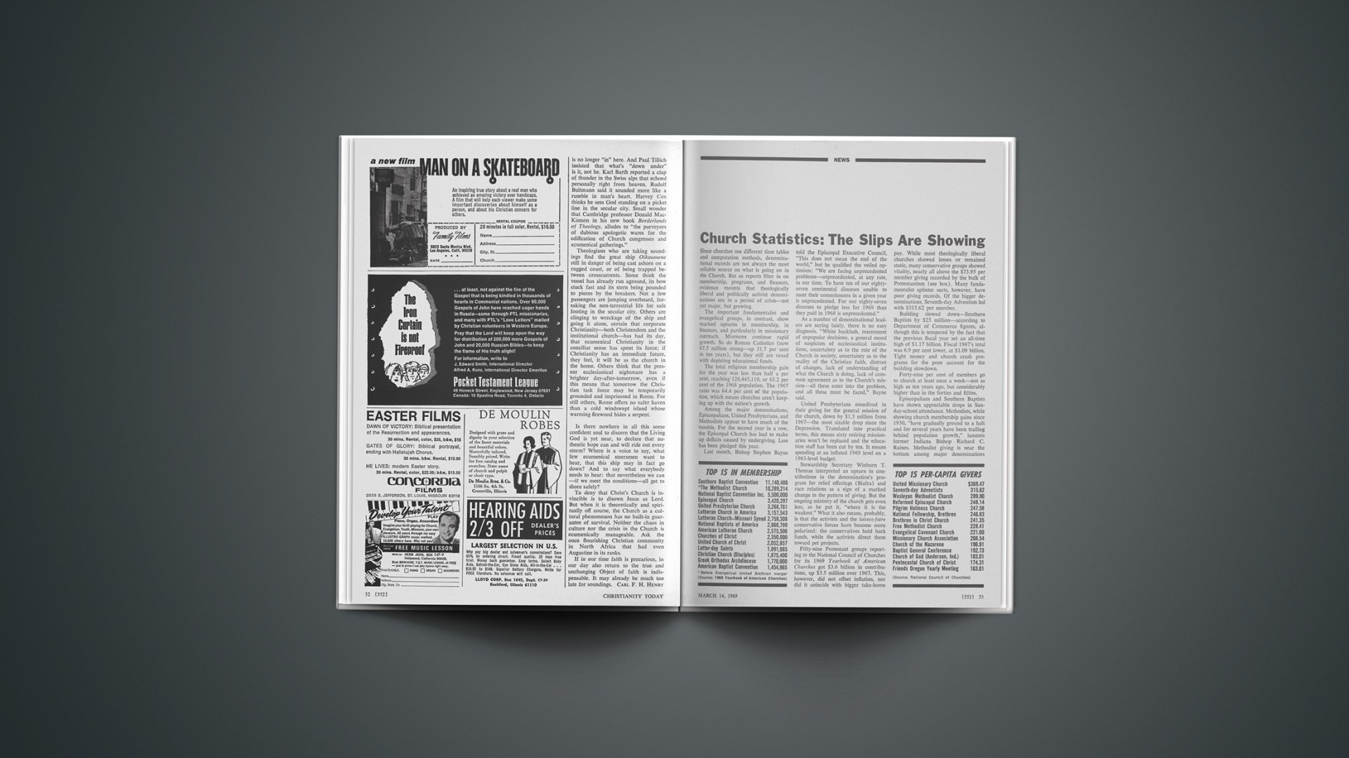 United Presbyterians nosedived in their giving for the general mission of the church, down by $1.3 million from 1967—the most sizable drop since the Depression. Translated into practical terms, this means sixty retiring missionaries won’t be replaced and the education staff has been cut by ten. It means spending at an inflated 1969 level on a 1963-level budget.