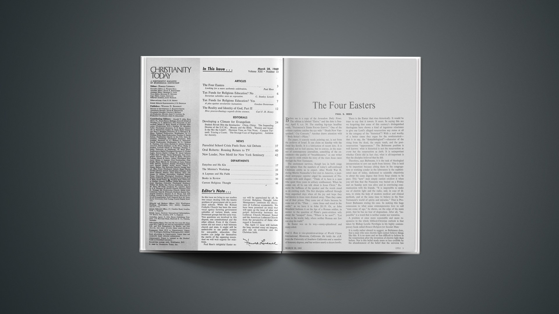 There is the Easter that rises historically. It would be truer to say that it towers. It soars. In saying this are we forgetting that some of this century’s distinguished theologians have shown a kind of ingenious reluctance to give our Lord’s alleged resurrection any status at all in the category of the “historical”? With a zeal worthy of a better cause they argue for the nonhistorical—that is to say, the “demythologized”—character of the rising from the dead, the empty tomb, and the post-resurrection “appearances.” The Bultmann position is well known: what is historical is not the resurrection as event but the resurrection as faith. It is unimportant whether Christ did in fact rise; what is all-important is that the disciples believed that he did.