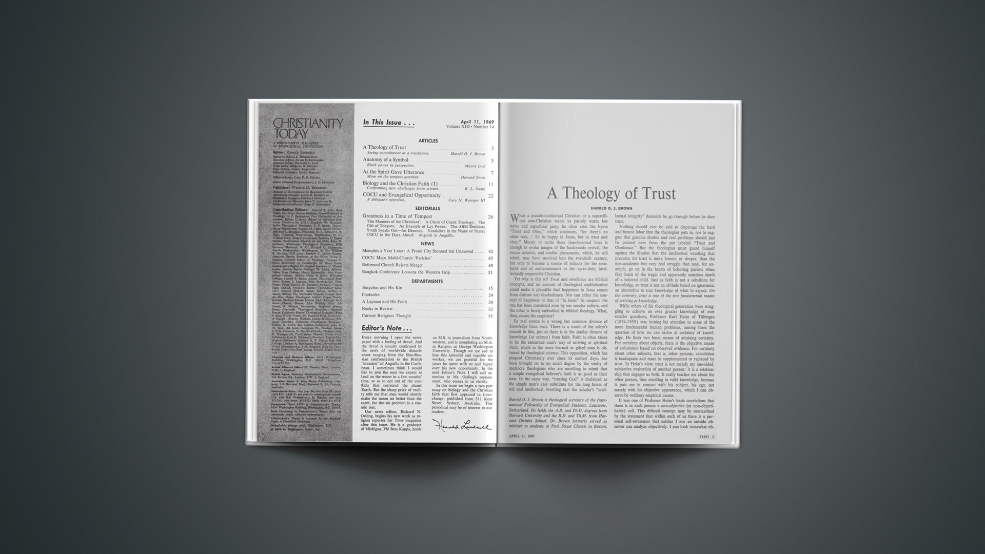 Our news editor, Richard N. Ostling, begins his new work as religion reporter for Time magazine after this issue. He is a graduate of Michigan, Phi Beta Kappa, holds an M.S. in journalism from Northwestern, and is completing an M.A. in Religion at George Washington University. Though we are sad to lose this splendid and capable coworker, we are grateful for the years he spent with us and happy over his new opportunity. In the next Editor’s Note I will call attention to Mr. Ostling’s replacement, who comes to us shortly.
