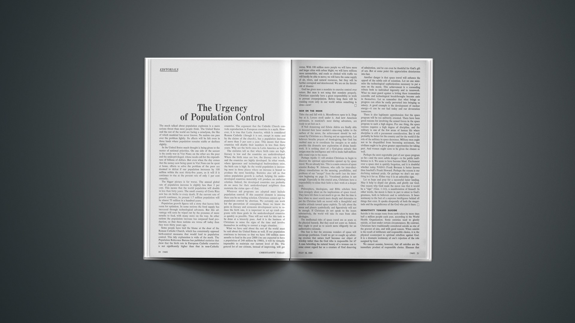 Whatever aid programs are adopted must include population control. If this essential element is missing there can be no lasting solution. Christians cannot opt for population control by abortion. We certainly can work for the prevention of conception. Since we know the gains in literacy and economic development serve to reduce the birth rate, it is important to set up crash programs with these goals in the underdeveloped countries as quickly as possible. Time will not wait for this task to be done at a leisurely pace. And it is the business of Christians to sense the signs of the time and involve themselves in seeking to correct a tragic situation.