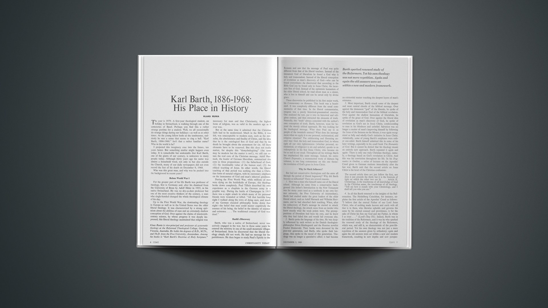 The year is 1979. A first-year theological student, on holiday in Switzerland, is walking through one of the cemeteries of Basel. Perhaps you find this a rather strange pastime for a student. Well, we all occasionally do strange things during our holidays—as well as at other times. As the young fellow looks at the tombstones, suddenly he sees a name that seems to ring a bell. “Karl Barth, 1886–1968.” Isn’t that a rather familiar name? Who in the world is he?