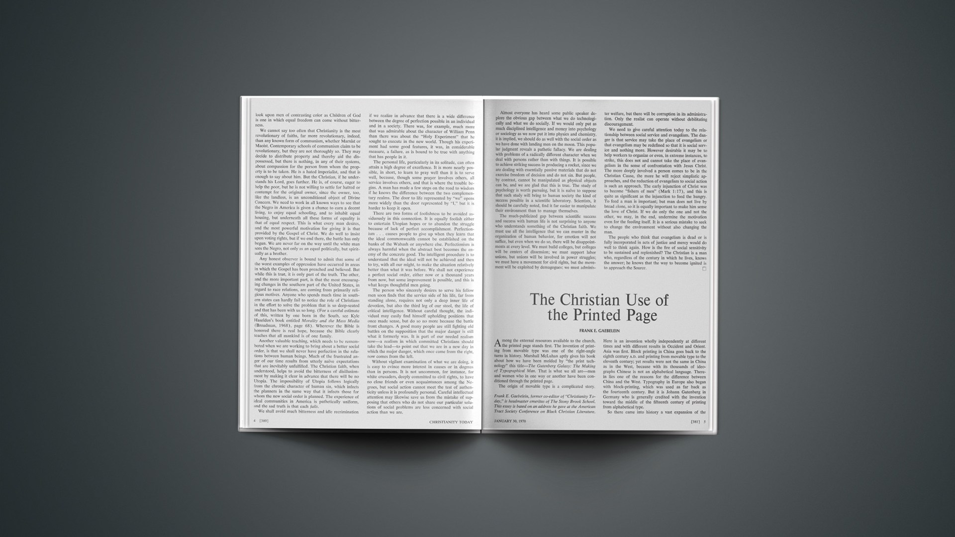 That word frontier points to a challenge for our Christian use of the printed page today. Geographically, America has only one remaining frontier, sparsely populated Alaska. Sociologically and spiritually, however, frontiers lie all around us, with explosive ones in every city and in every state. For this is a day of frontiers between young and old, between rebels and the establishment, between white and black. But while education, politics, and the mass media-cannot by themselves transcend these barriers between people, the Bible can cross every frontier and the Christ whom it proclaims can reconcile men to one another and to himself through his redeeming love. It is his truth that makes men free from the barriers that shut them off from accepting one another as members of the common brotherhood for whom Christ died. And that truth can be dynamically presented in writing.
