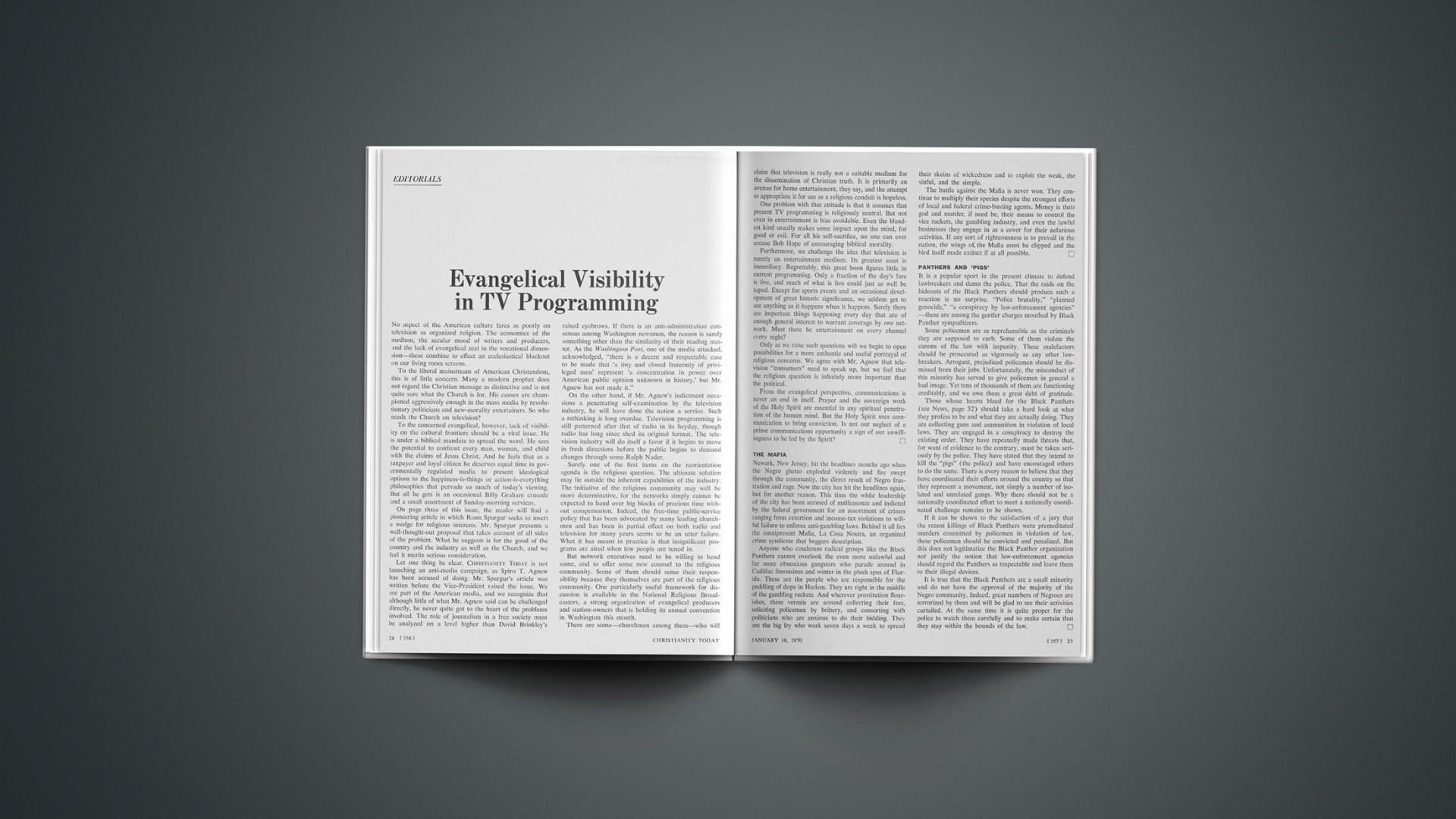 Let one thing be clear. CHRISTIANITY TODAY is not launching an anti-media campaign, as Spiro T. Agnew has been accused of doing. Mr. Spargur’s article was written before the Vice-President raised the issue. We are part of the American media, and we recognize that although little of what Mr. Agnew said can be challenged directly, he never quite got to the heart of the problems involved. The role of journalism in a free society must be analyzed on a level higher than David Brinkley’s raised eyebrows. If there is an anti-administration consensus among Washington newsmen, the reason is surely something other than the similarity of their reading matter. As the Washington Post, one of the media attacked, acknowledged, “there is a decent and respectable case to be made that ‘a tiny and closed fraternity of privileged men’ represent ‘a concentration in power over American public opinion unknown in history,’ but Mr. Agnew has not made it.”