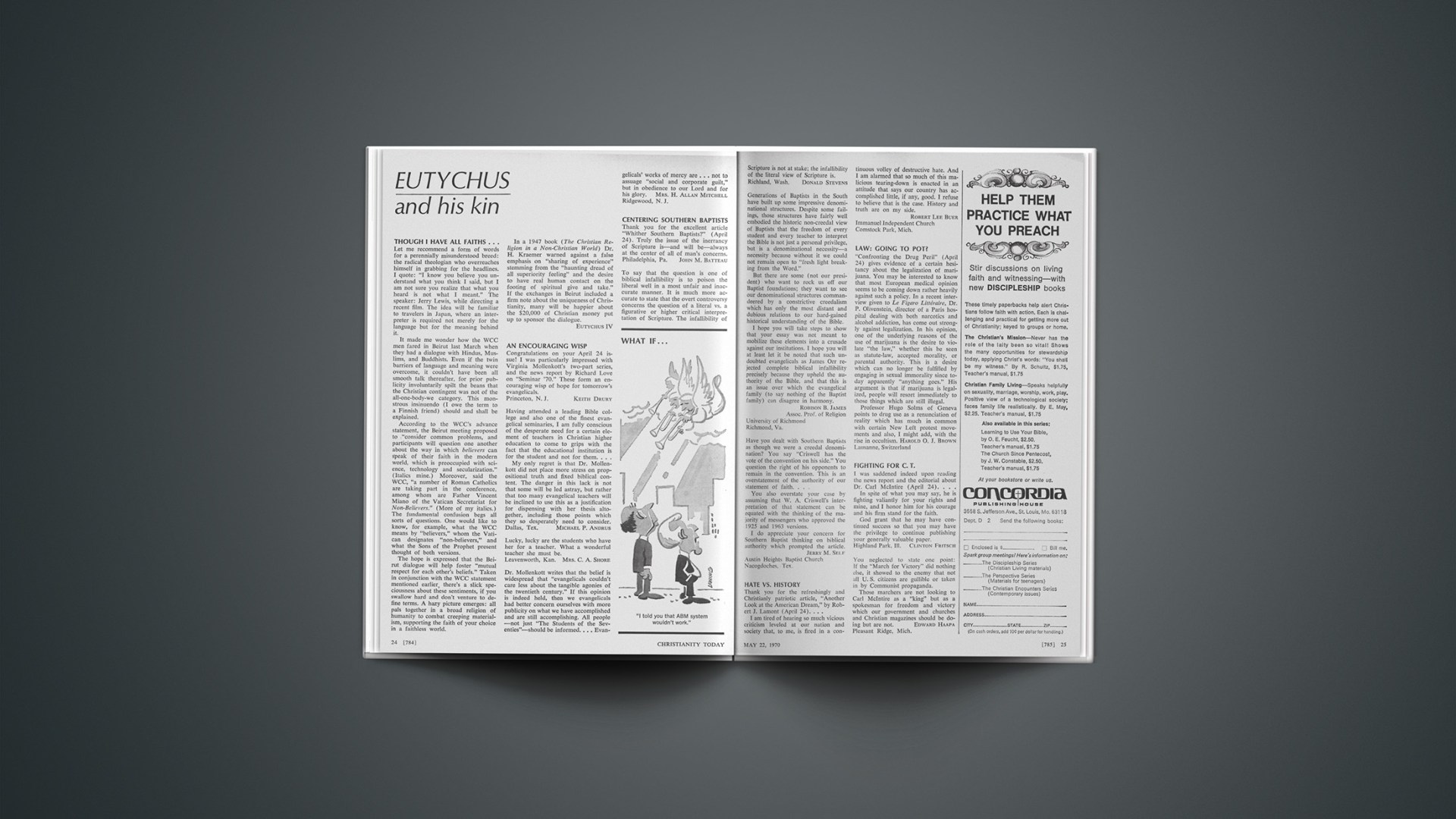 Congratulations on your April 24 issue! I was particularly impressed with Virginia Mollenkott’s two-part series, and the news report by Richard Love on “Seminar ’70.” These form an encouraging wisp of hope for tomorrow’s evangelicals.