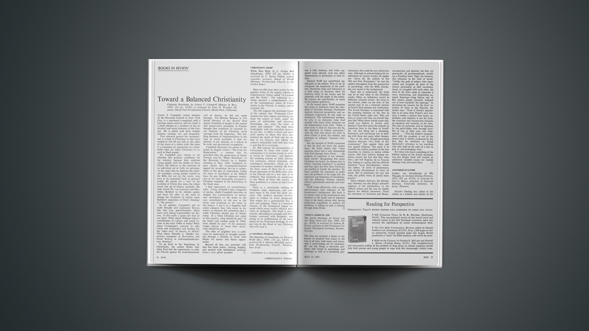 Ernest T. Campbell, senior minister of the Riverside Church in New York City, is a convinced evangelical with a burning social concern, and his book is a fresh attempt at a synthesis of the individual and social elements of the Gospel. He is gifted with keen insight, balance, courage, wit, and eloquence.