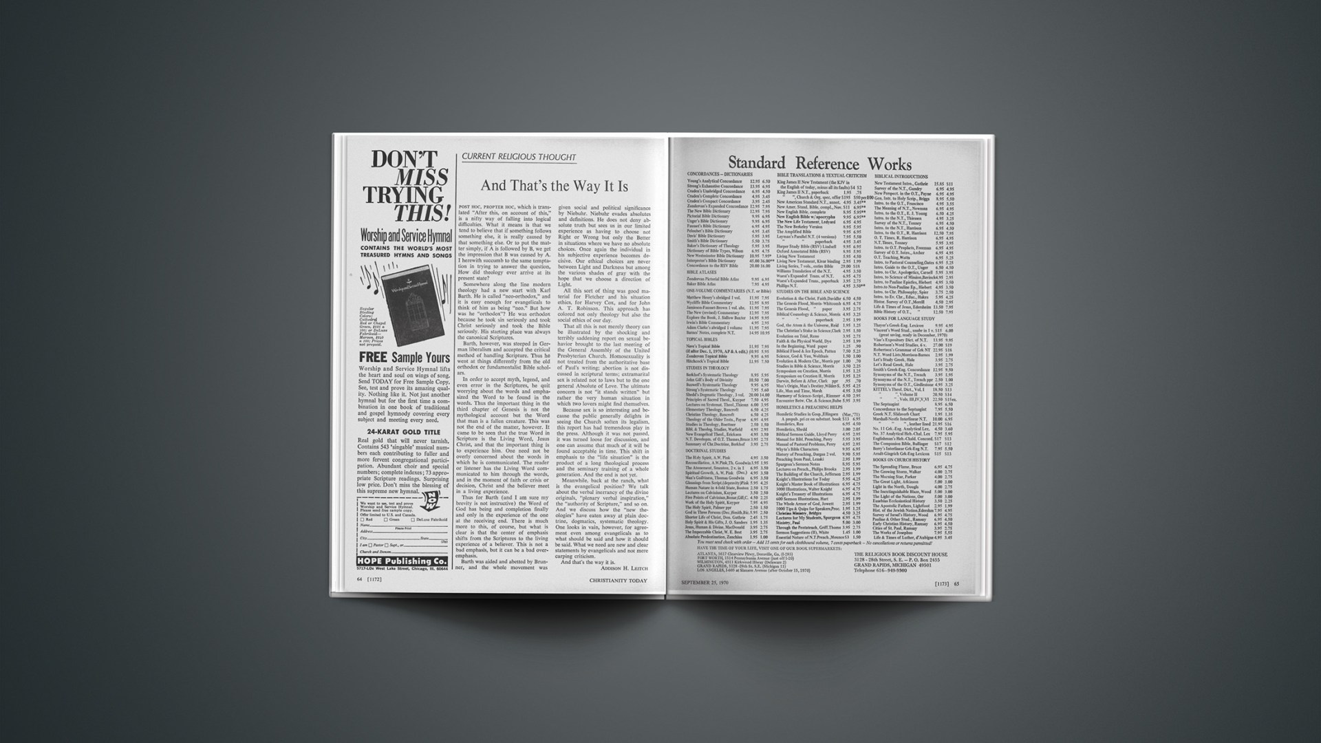 All this sort of thing was good material for Fletcher and his situation ethics, for Harvey Cox, and for John A. T. Robinson. This approach has colored not only theology but also the social ethics of our day.