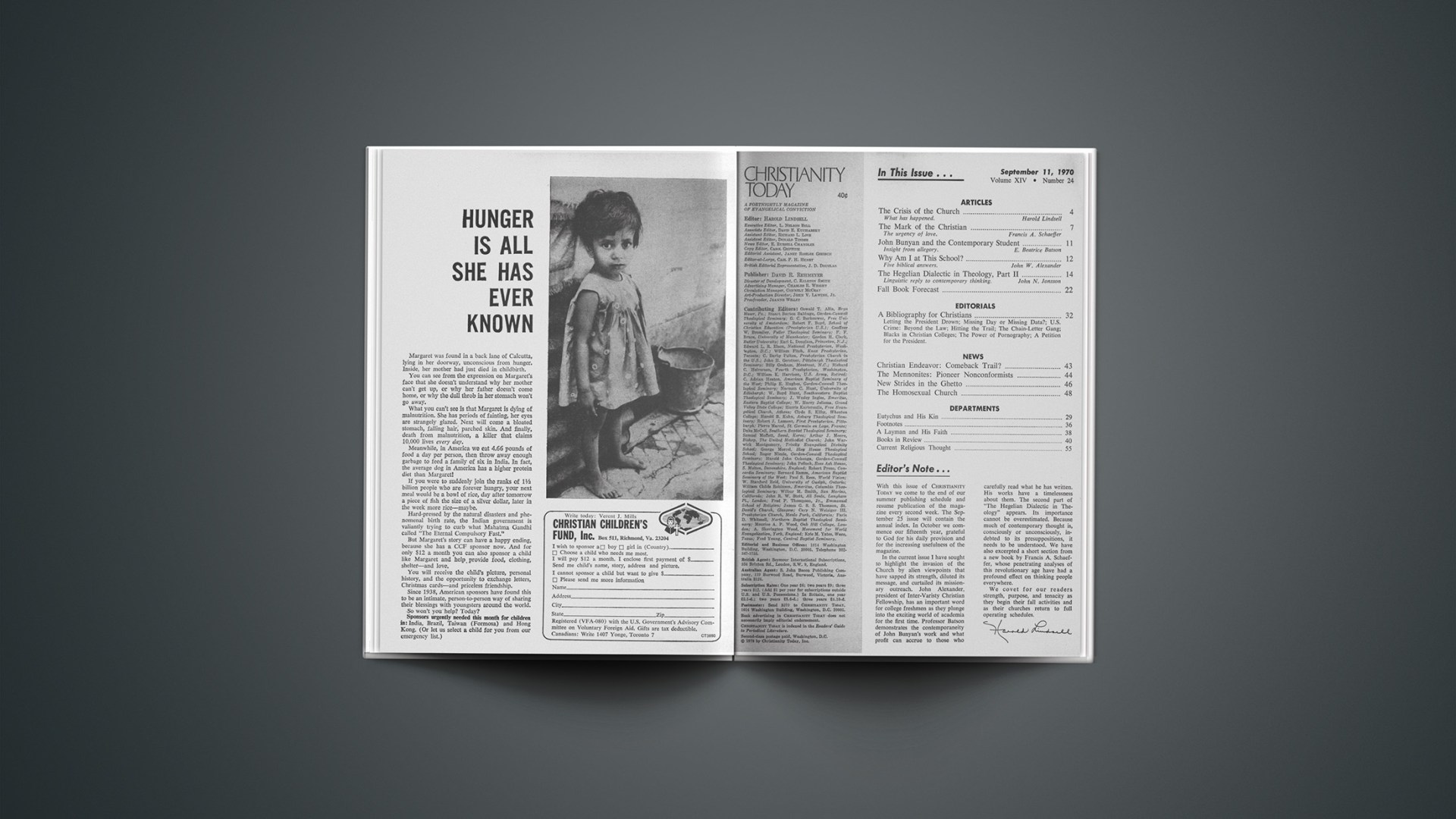 In the current issue I have sought to highlight the invasion of the Church by alien viewpoints that have sapped its strength, diluted its message, and curtailed its missionary outreach. John Alexander, president of Inter-Varisty Christian Fellowship, has an important word for college freshmen as they plunge into the exciting world of academia for the first time. Professor Batson demonstrates the contemporaneity of John Bunyan’s work and what profit can accrue to those who carefully read what he has written. His works have a timelessness about them. The second part of “The Hegelian Dialectic in Theology” appears. Its importance cannot be overestimated. Because much of contemporary thought is, consciously or unconsciously, indebted to its presuppositions, it needs to be understood. We have also excerpted a short section from a new book by Francis A. Schaeffer, whose penetrating analyses of this revolutionary age have had a profound effect on thinking people everywhere.
