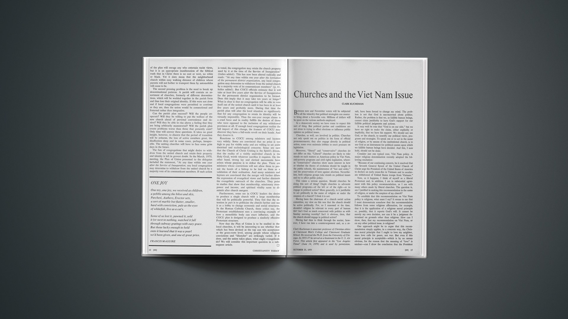 Clark Kucheman is associate professor of Christian ethics at Claremont Men’s College and Claremont Graduate School. He received the Ph.D. from the University of Chicago. In 1955–57 he served as a lieutenant in the U. S. Air Force. This article first appeared in the “Los Angeles Times” (June 14, 1970) and is used by permission.