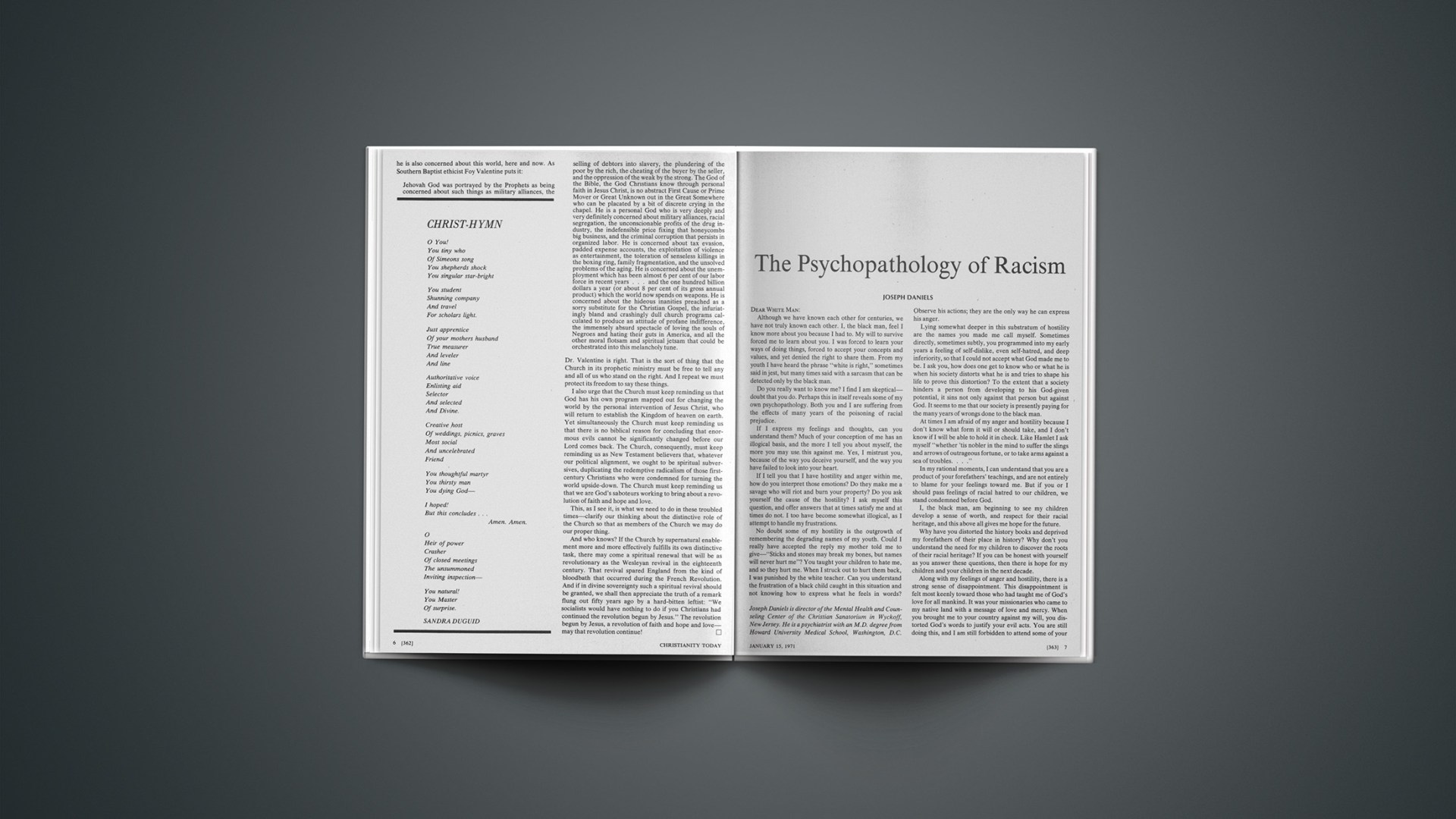 Joseph Daniels is director of the Mental Health and Counseling Center of the. Christian Sanatorium in Wyckoff, New Jersey. He is a psychiatrist with an M.D. degree from Howard University Medical School, Washington, D.C.