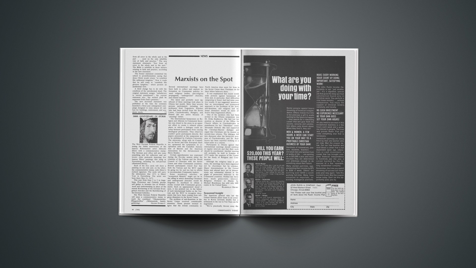 The United Presbyterian Church reported that for the first time since 1967 giving to the general mission of the church was up for a quarterly period: an 18 per cent increase for the first quarter of 1971. Local income also rose markedly.