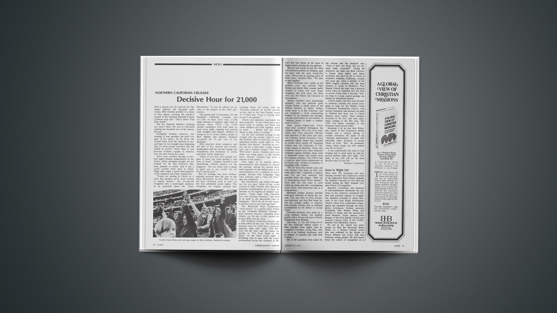 Summing it all up was Jack Whitesell, pastor of San Francisco’s Bethel Temple and a veteran adviser to crusade counselors. He spoke of the “absolute superficiality” of some who ostensibly make decisions to accept Christ as Lord. “But,” he continued, “many others break out with radiant new life in Christ.”