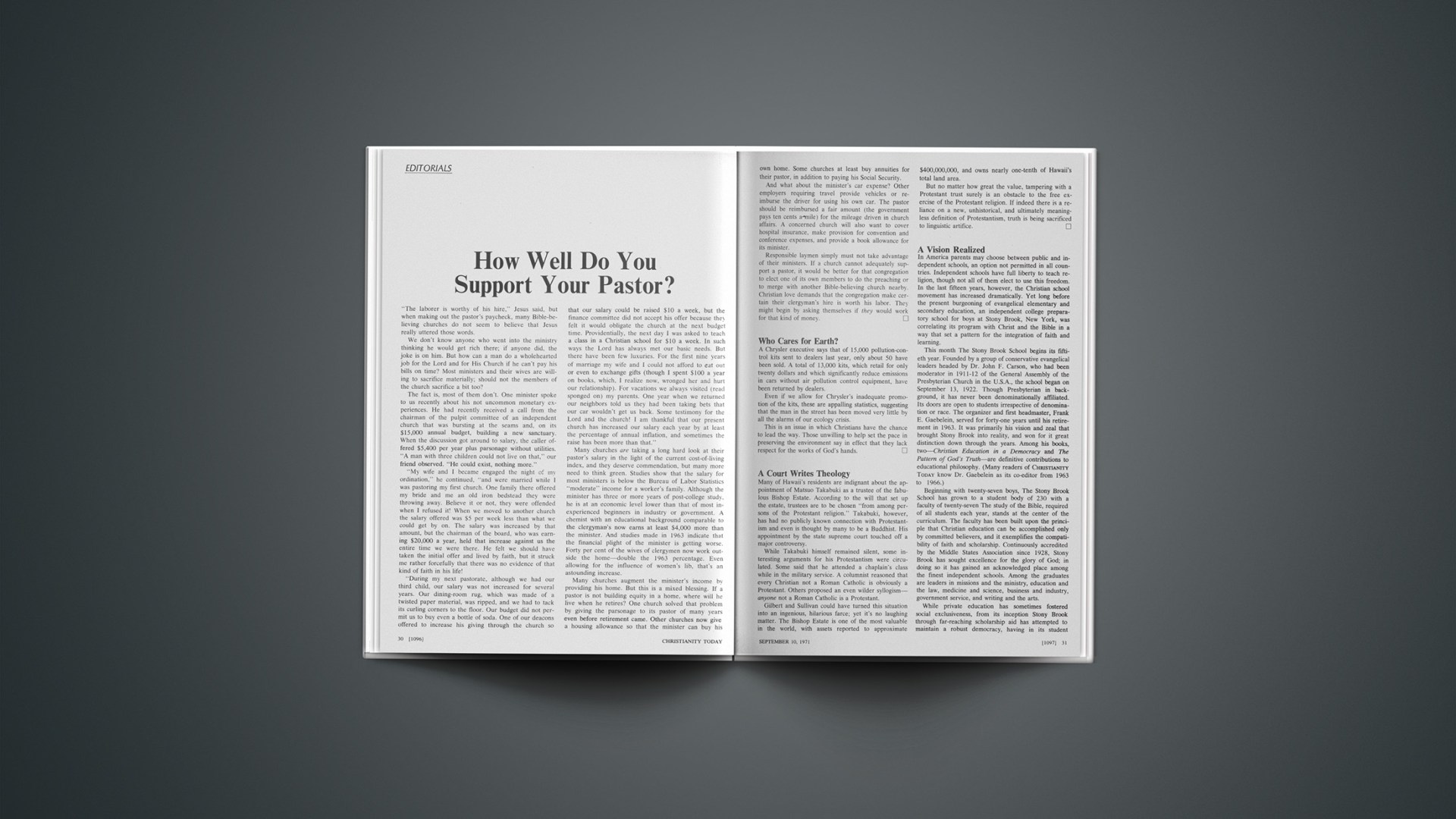 The fact is, most of them don’t. One minister spoke to us recently about his not uncommon monetary experiences. He had recently received a call from the chairman of the pulpit committee of an independent church that was bursting at the seams and, on its $15,000 annual budget, building a new sanctuary. When the discussion got around to salary, the caller offered $5,400 per year plus parsonage without utilities. “A man with three children could not live on that,” our friend observed. “He could exist, nothing more.”