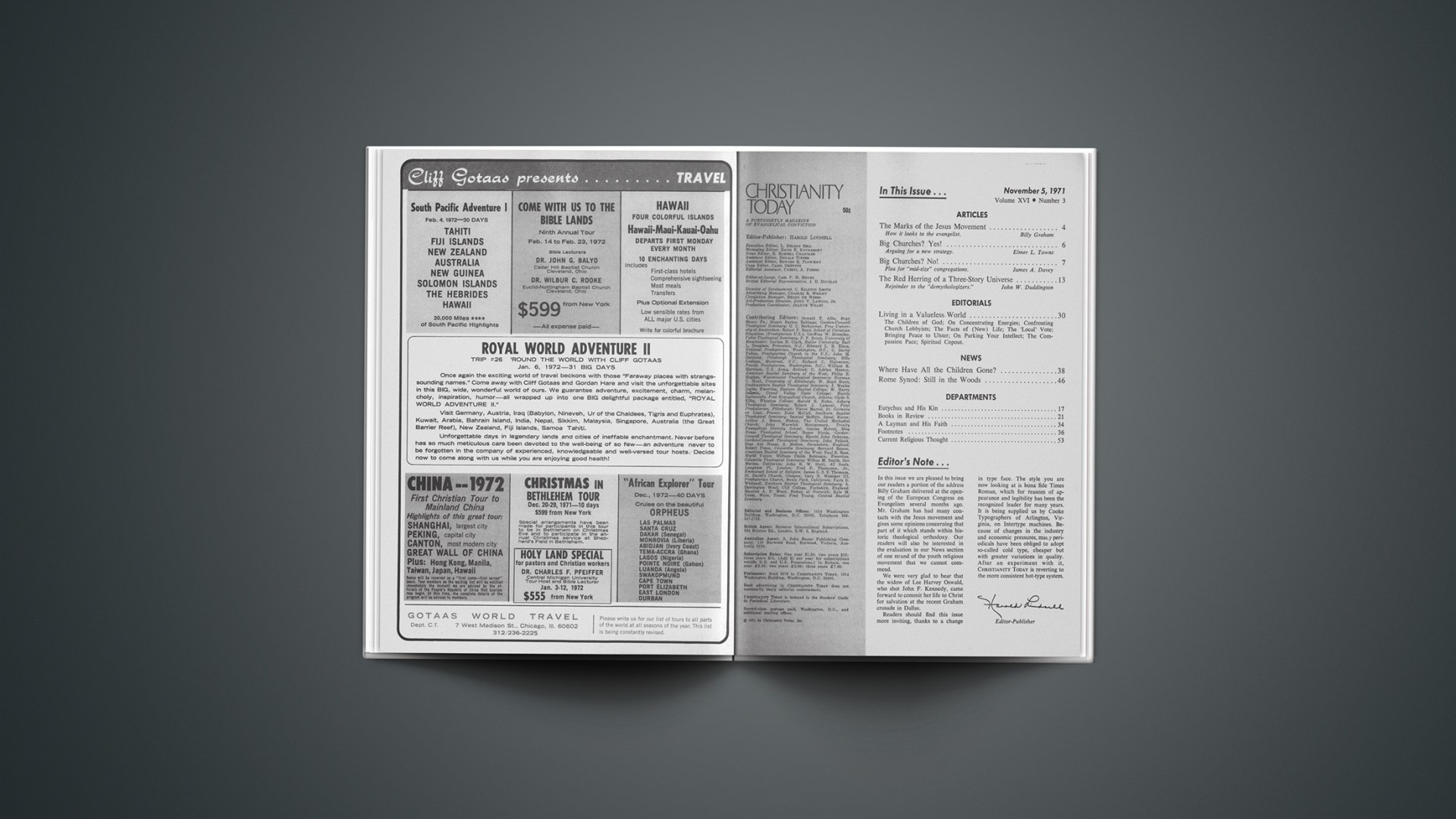 In this issue we are pleased to bring our readers a portion of the address Billy Graham delivered at the opening of the European Congress on Evangelism several months ago. Mr. Graham has had many contacts with the Jesus movement and gives some opinions concerning that part of it which stands within historic theological orthodoxy. Our readers will also be interested in the evaluation in our News section of one strand of the youth religious movement that we cannot commend.