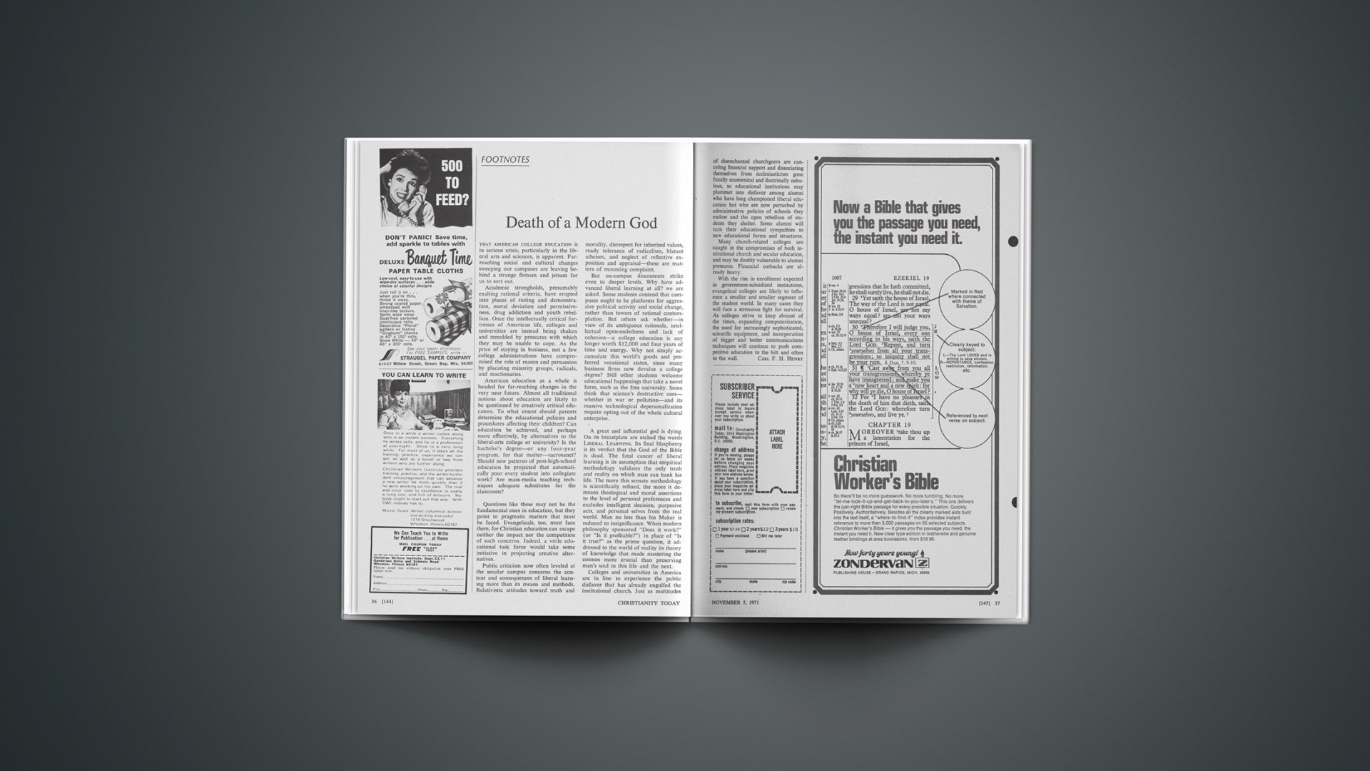 Colleges and universities in America are in line to experience the public disfavor that has already engulfed the institutional church. Just as multitudes of disenchanted churchgoers are canceling financial support and dissociating themselves from ecclesiasticism gone fuzzily ecumenical and doctrinally nebulous, so educational institutions may plummet into disfavor among alumni who have long championed liberal education but who are now perturbed by administrative policies of schools they endow and the open rebellion of students they shelter. Some alumni will turn their educational sympathies to new educational forms and structures.