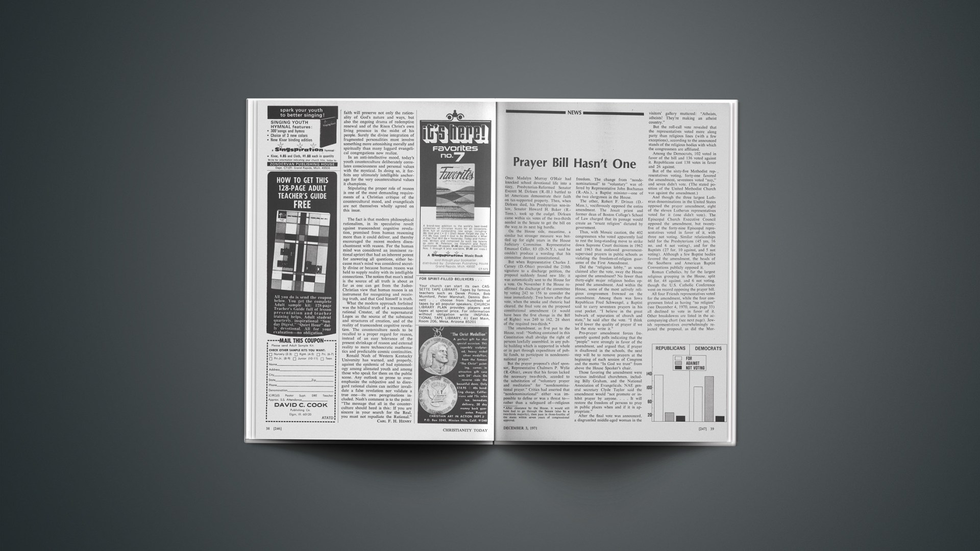 All four Friends representatives voted for the amendment, while the four congressmen listed as having “no religion” (see December 4, 1970, issue, page 33) all declined to vote in favor of it. Other breakdowns are listed in the accompanying chart (see next page). Jewish representatives overwhelmingly rejected the proposal, as did the Mormons, while those of the United Church of Christ, following the denomination’s lead, voted 7 yes, 12 no, with 2 not voting.