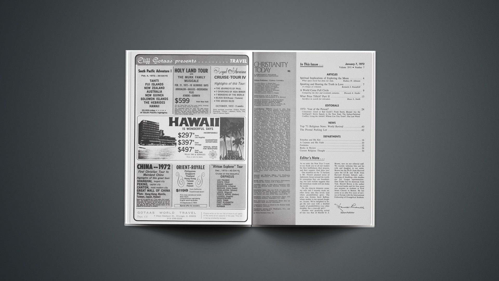 Another very gratifying arrival of late was that of Harold O. J. Brown, now on our editorial staff. We warmly welcome him and his wife and daughter to our midst. Brown has the Ph.D. from Harvard (plus the S.T.B. and Th.M. from Harvard Divinity School) and—speaking of doubling—this doubles our Ivy League representation: Don Tinder has his doctorate from Yale. Harold Brown is the author of several books and for four years was minister to students at Park Street Church in Boston. He has come to us after five years of service in Europe with the International Fellowship of Evangelical Students.