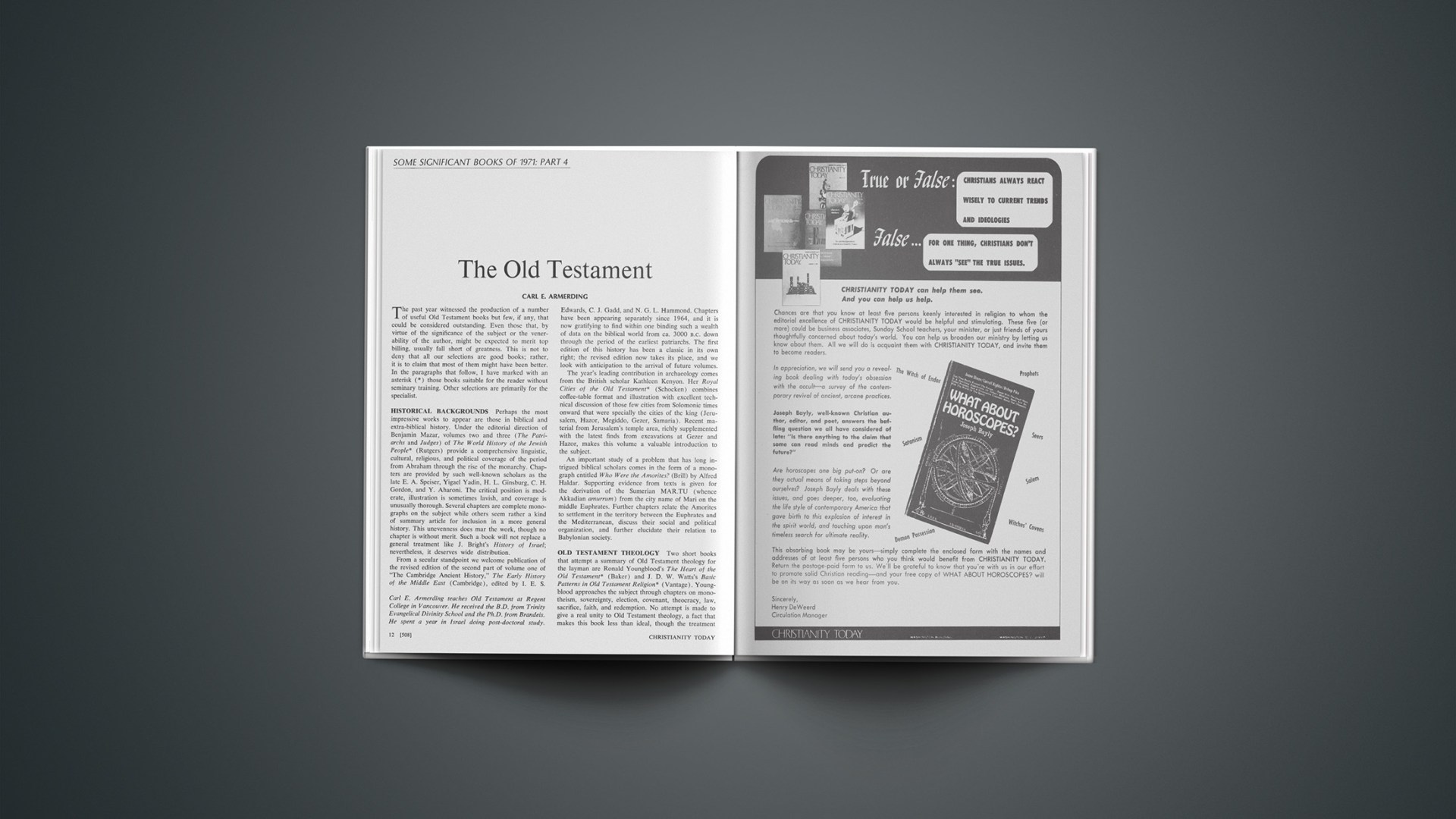 Carl E. Armerding teaches Old Testament at Regent College in Vancouver. He received the B.D. from Trinity Evangelical Divinity School and the Ph.D. from Brandeis. He spent a year in Israel doing post-doctoral study.