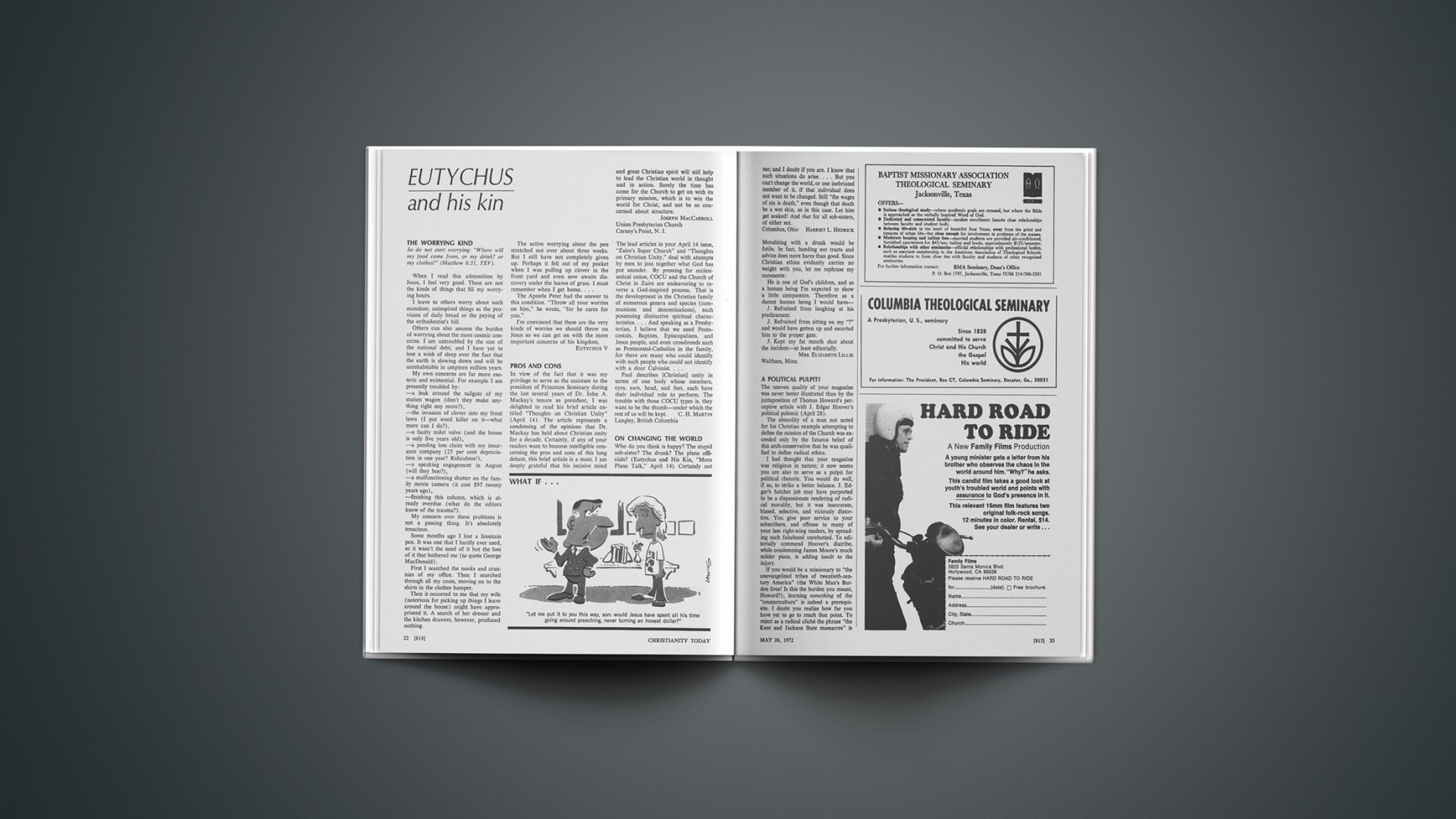 The lead articles in your April 14 issue, “Zaire’s Super Church” and “Thoughts on Christian Unity,” deal with attempts by men to join together what God has put asunder. By pressing for ecclesiastical union, COCU and the Church of Christ in Zaire are endeavoring to reverse a God-inspired process. That is the development in the Christian family of numerous genera and species (communions and denominations), each possessing distinctive spiritual characteristics.… And speaking as a Presbyterian, I believe that we need Pentecostals, Baptists, Episcopalians, and Jesus people, and even crossbreeds such as Pentecostal-Catholics in the family, for there are many who could identify with such people who could not identify with a dour Calvinist.…