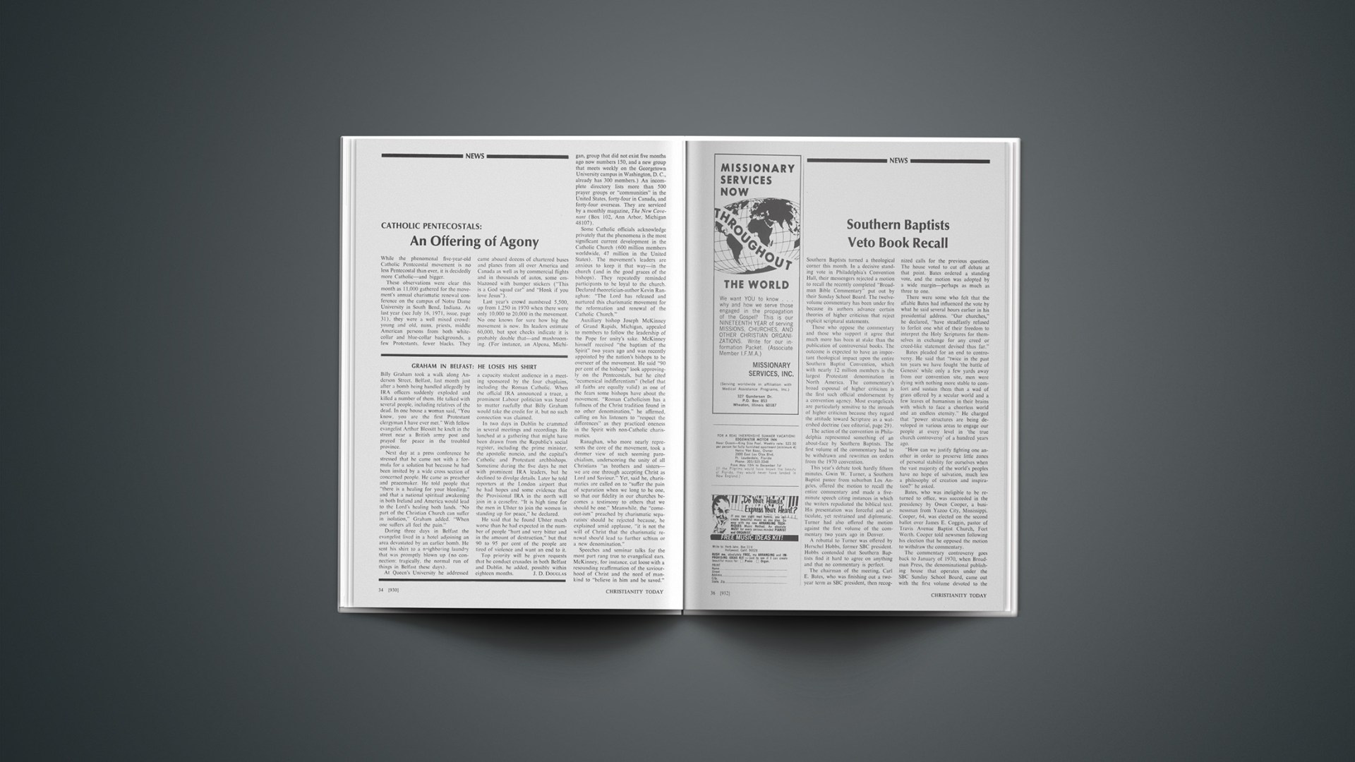 Billy Graham took a walk along Anderson Street. Belfast, last month just after a bomb being handled allegedly by IRA officers suddenly exploded and killed a number of them. He talked with several people, including relatives of the dead. In one house a woman said, “You know, you are the first Protestant clergyman I have ever met.” With fellow evangelist Arthur Blessitt he knelt in the street near a British army post and prayed for peace in the troubled province.