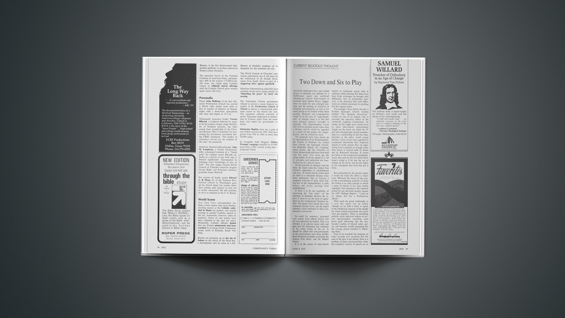 I mention the above for no mischievous purpose, and not simply to highlight an extreme example of disunity within my own church. The Church of Scotland (which comprises some 85 per cent of the church membership represented in the six bodies) has in the last decade conducted individual talks with four of the others. All of them began with high hopes; all have quietly foundered. Are we then to evolve a new Parkinson’s Law for ecumenical man—that unity prospects are enhanced as dissident elements increase? That after four discordant duets a sextet of the same fumbling trumpeters will blend in harmony? Moreover, will they choose the right music to play?