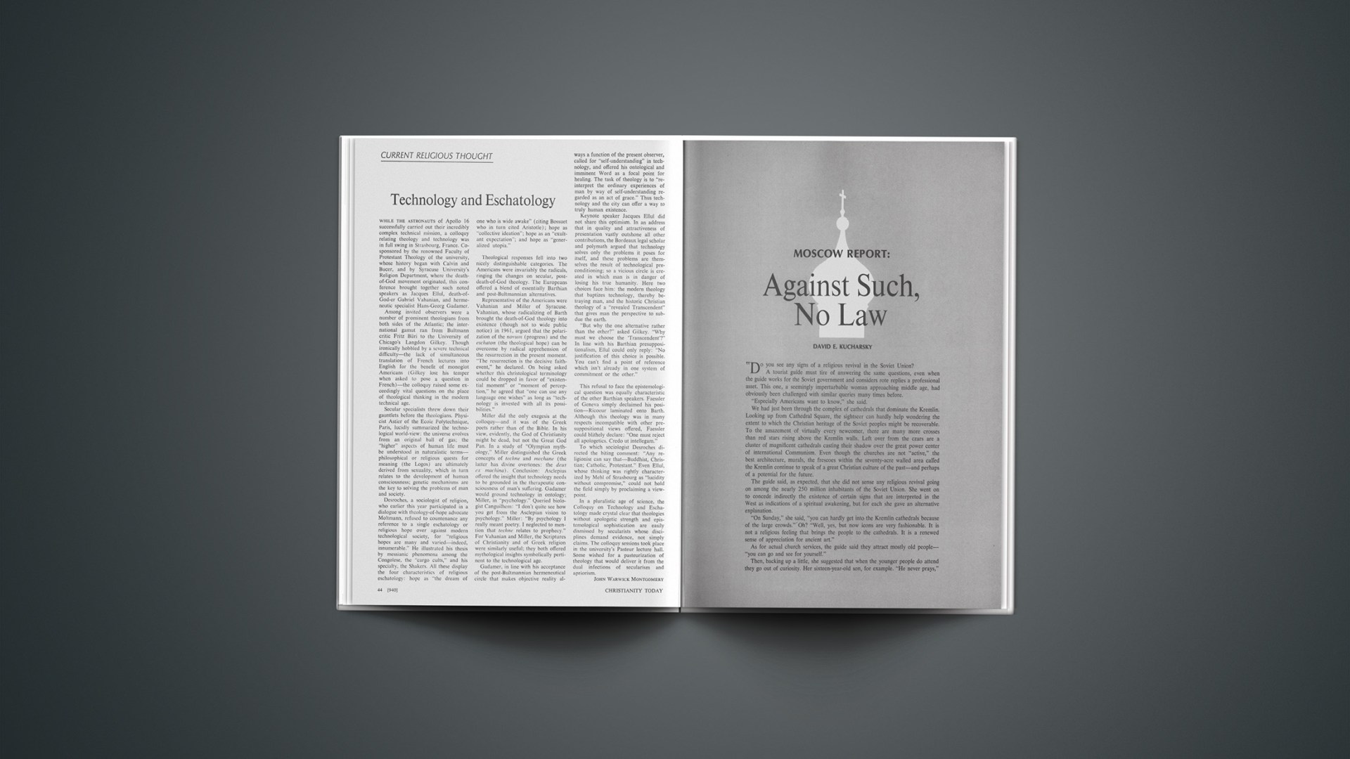 While the astronauts of Apollo 16 successfully carried out their incredibly complex technical mission, a colloquy relating theology and technology was in full swing in Strasbourg, France. Cosponsored by the renowned Faculty of Protestant Theology of the university, whose history began with Calvin and Bucer, and by Syracuse University’s Religion Department, where the death-of-God movement originated, this conference brought together such noted speakers as Jacques Ellul, death-of-God-er Gabriel Vahanian, and hermeneutic specialist Hans-Georg Gadamer.