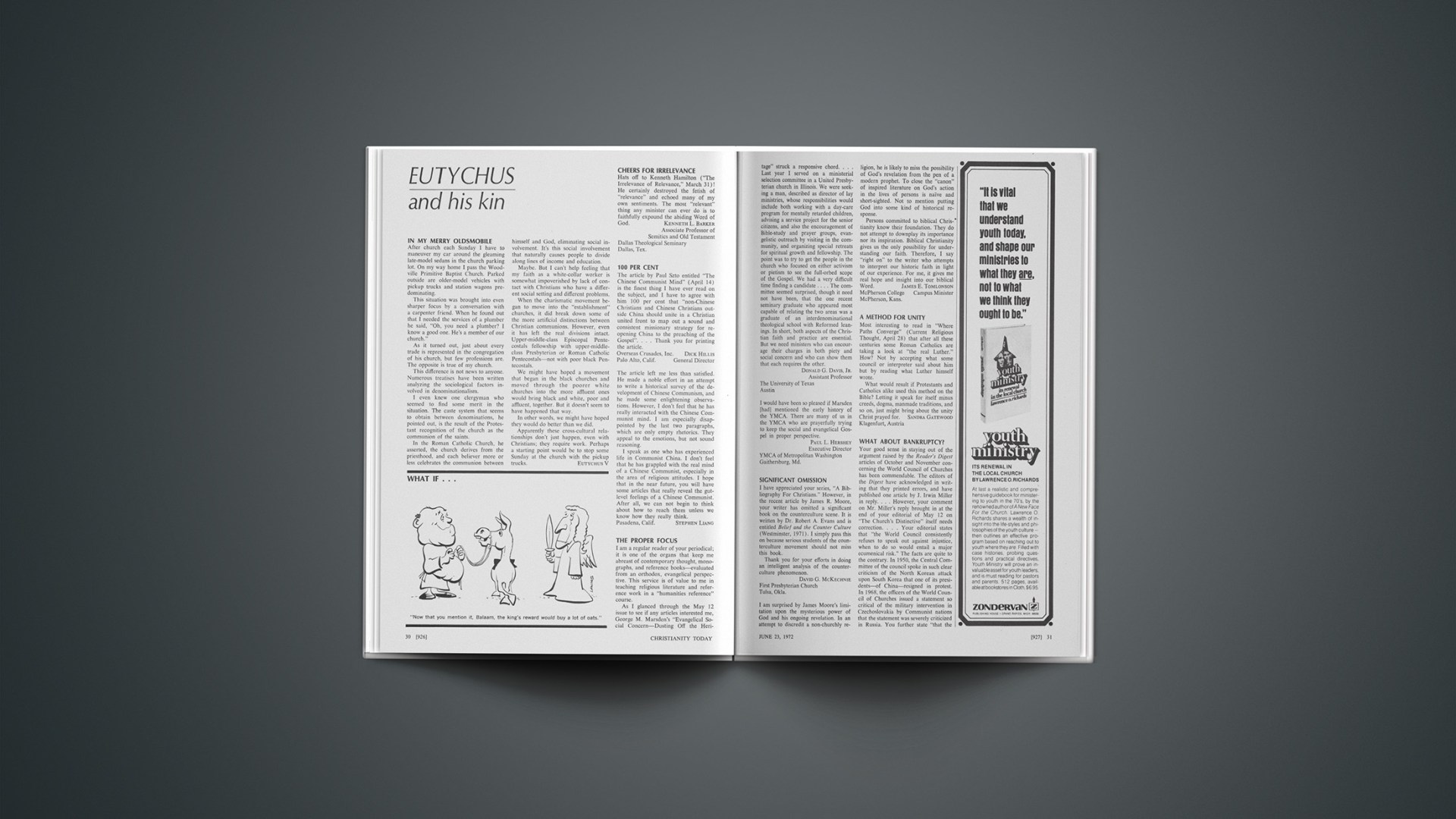 As I glanced through the May 12 issue to see if any articles interested me, George M. Marsden’s “Evangelical Social Concern—Dusting Off the Heritage” struck a responsive chord.… Last year I served on a ministerial selection committee in a United Presbyterian church in Illinois. We were seeking a man, described as director of lay ministries, whose responsibilities would include both working with a day-care program for mentally retarded children, advising a service project for the senior citizens, and also the encouragement of Bible-study and prayer groups, evangelistic outreach by visiting in the community, and organizing special retreats for spiritual growth and fellowship. The point was to try to get the people in the church who focused on either activism or pietism to see the full-orbed scope of the Gospel. We had a very difficult time finding a candidate.… The committee seemed surprised, though it need not have been, that the one recent seminary graduate who appeared most capable of relating the two areas was a graduate of an interdenominational theological school with Reformed leanings. In short, both aspects of the Christian faith and practice are essential. But we need ministers who can encourage their charges in both piety and social concern and who can show them that each requires the other.