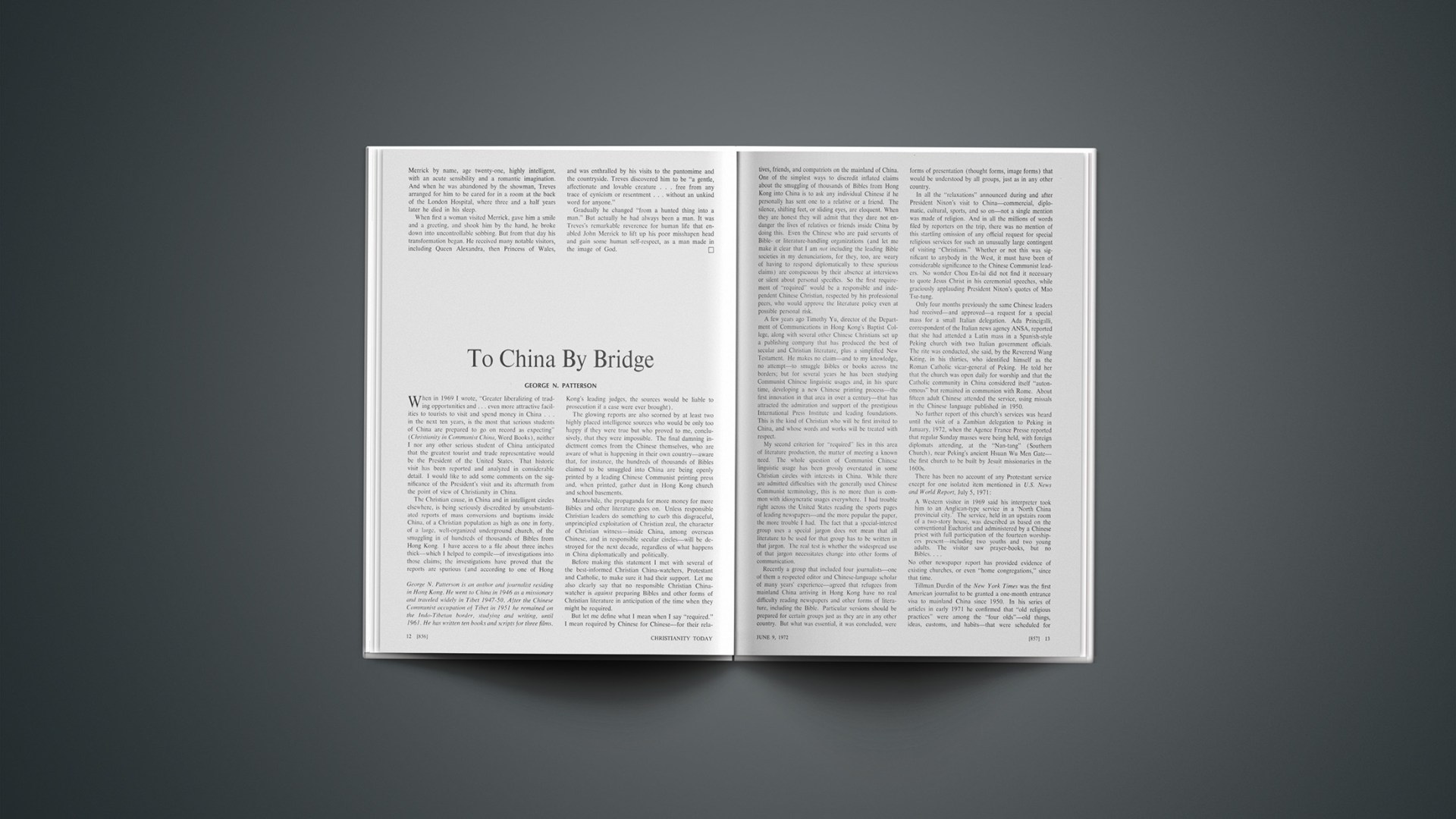 A few years ago Timothy Yu, director of the Department of Communications in Hong Kong’s Baptist College, along with several other Chinese Christians set up a publishing company that has produced the best of secular and Christian literature, plus a simplified New Testament. He makes no claim—and to my knowledge, no attempt—to smuggle Bibles or books across the borders; but for several years he has been studying Communist Chinese linguistic usages and, in his spare time, developing a new Chinese printing process—the first innovation in that area in over a century—that has attracted the admiration and support of the prestigious International Press Institute and leading foundations. This is the kind of Christian who will be first invited to China, and whose words and works will be treated with respect.