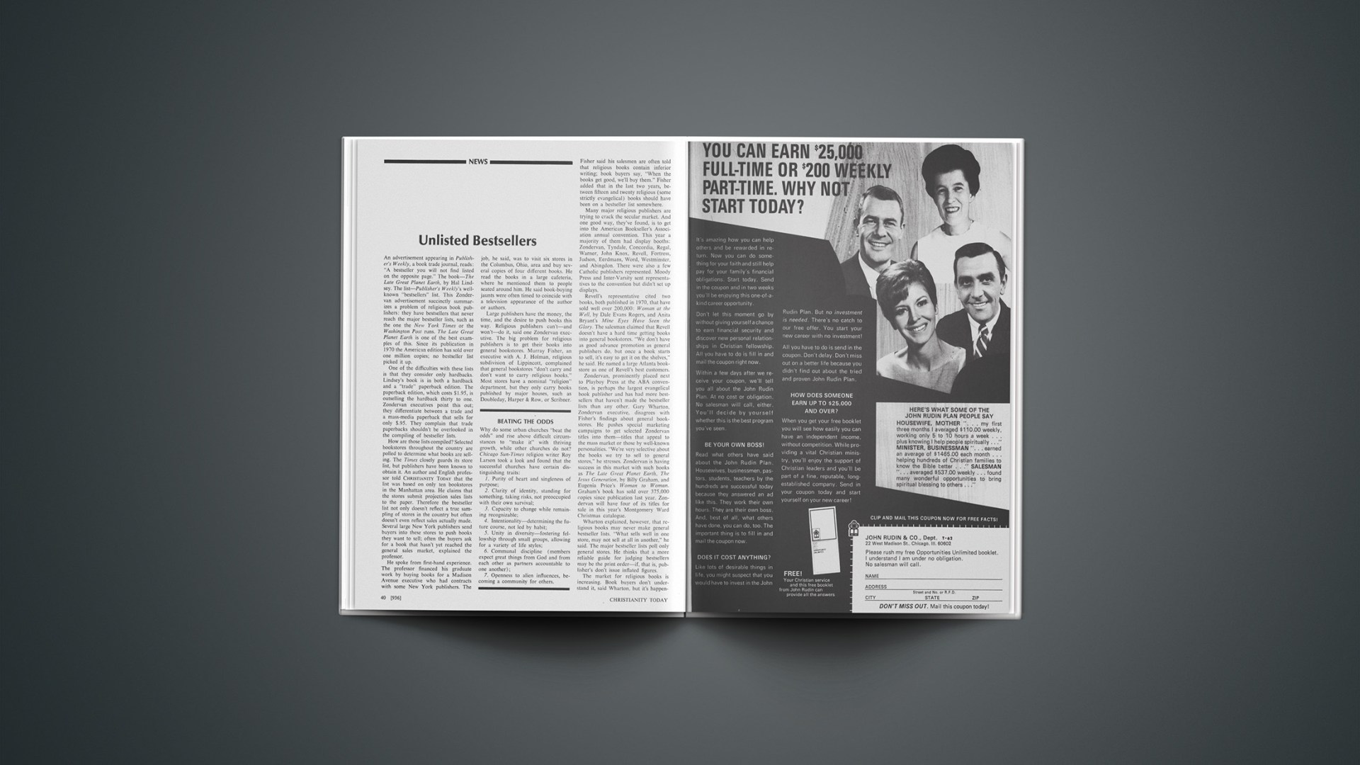 Zondervan, prominently placed next to Playboy Press at the ABA convention, is perhaps the largest evangelical book publisher and has had more bestsellers that haven’t made the bestseller lists than any other. Gary Wharton, Zondervan executive, disagrees with Fisher’s findings about general bookstores. He pushes special marketing campaigns to get selected Zondervan titles into them—titles that appeal to the mass market or those by well-known personalities. “We’re very selective about the books we try to sell to general stores,” he stresses. Zondervan is having success in this market with such books as The Late Great Planet Earth, The Jesus Generation, by Billy Graham, and Eugenia Price’s Woman to Woman. Graham’s book has sold over 375,000 copies since publication last year. Zondervan will have four of its titles for sale in this year’s Montgomery Ward Christmas catalogue.