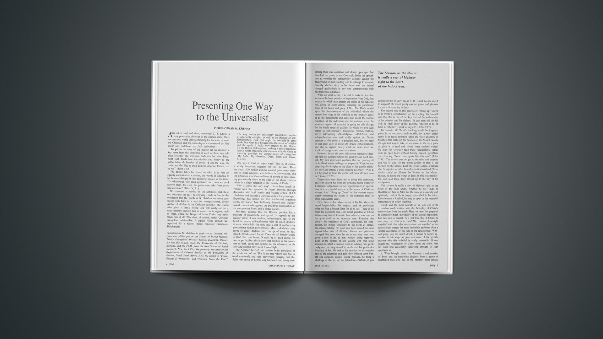 Purushotman M. Krishna is professor of Oriental religions and philosophy in the School of World Mission, Trinity Evangelical Divinity School, Deerfield, Illinois. He has the M.Litt. from the University of Durham, England, and the Ph.D. from the New School of Social Research, New York City. He formerly was head of the Department of Oriental Studies at the University of Durban, Natal, South Africa. He is the author of “Foundations of Hinduism” and “Journey From the East.”