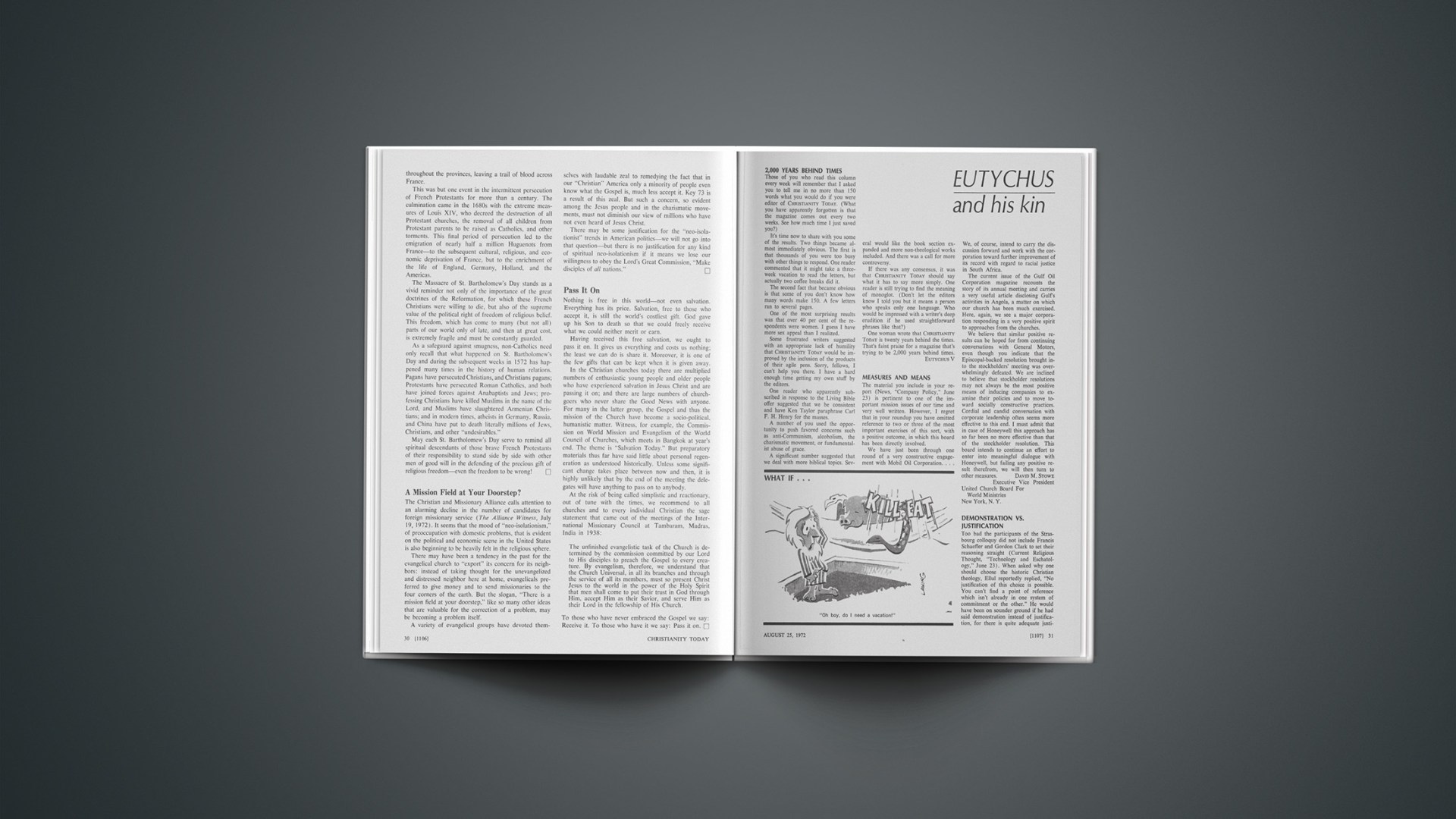 The Christian and Missionary Alliance calls attention to an alarming decline in the number of candidates for foreign missionary service (The Alliance Witness, July 19, 1972). It seems that the mood of “neo-isolationism,” of preoccupation with domestic problems, that is evident on the political and economic scene in the United States is also beginning to be heavily felt in the religious sphere.