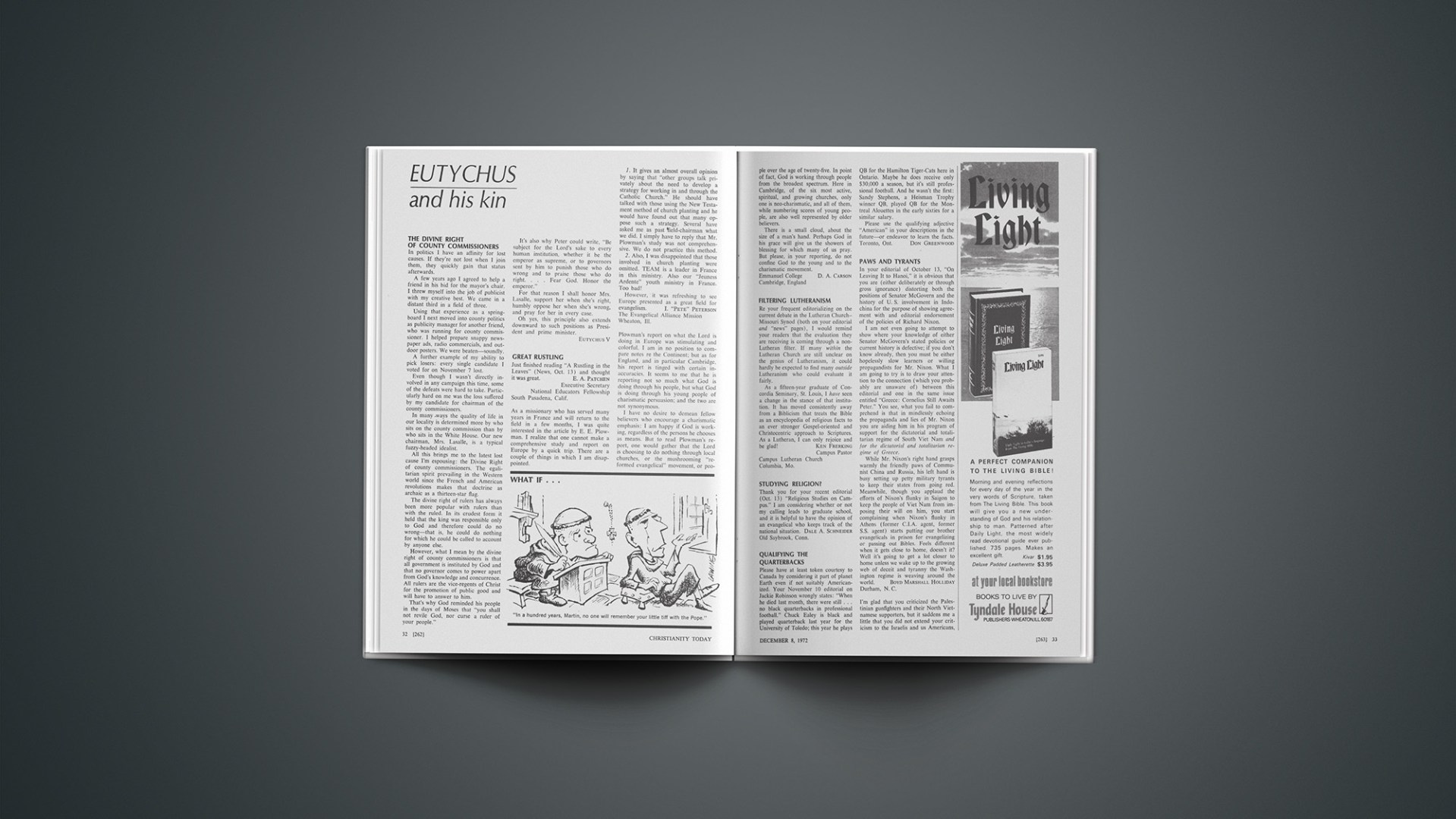 Re your frequent editorializing on the current debate in the Lutheran Church-Missouri Synod (both on your editorial and “news” pages), I would remind your readers that the evaluation they are receiving is coming through a non-Lutheran filter. If many within the Lutheran Church are still unclear on the genius of Lutheranism, it could hardly be expected to find many outside Lutheranism who could evaluate it fairly.