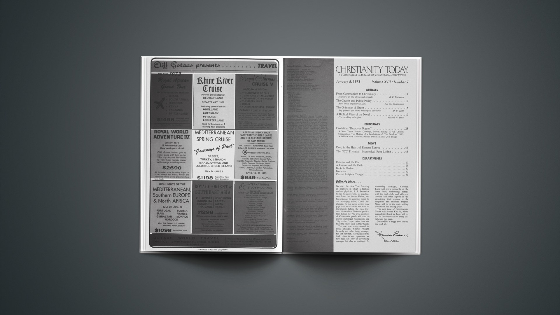 We start the New Year featuring an interview in which a brilliant nuclear physicist, B. P. Dotsenko, relates his conversion, his expatriation from the Soviet Union, and his responses to questions posed by our managing editor, David Kucharsky. In our news section (see page 44) we examine the state of Christianity behind the Iron Curtain. News editor Plowman predicts that during the 70s great numbers of Communist youth will turn to Christ; dialectical materialism and “big brother” supervision have not filled the empty void in their hearts.