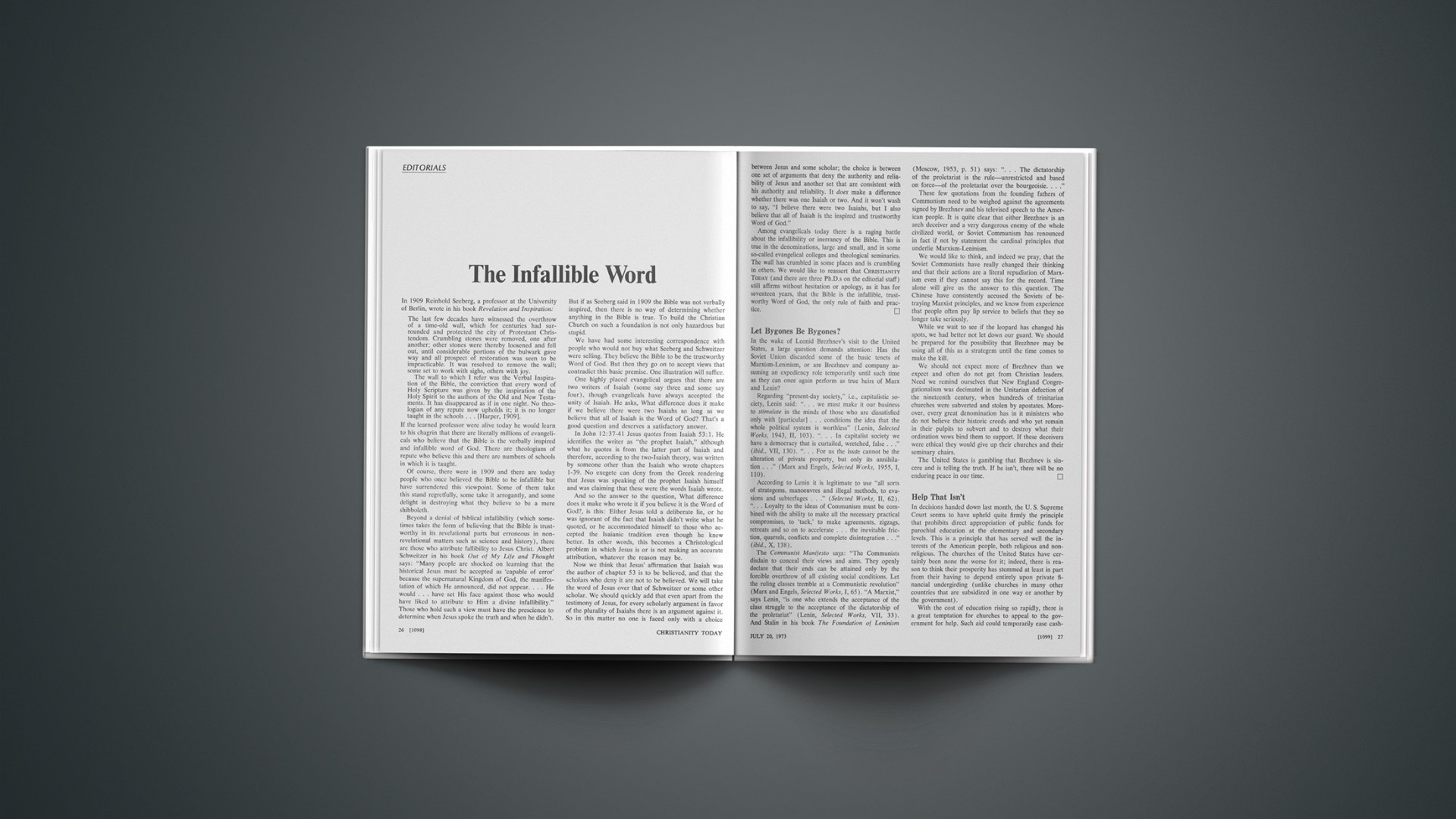 Among evangelicals today there is a raging battle about the infallibility or inerrancy of the Bible. This is true in the denominations, large and small, and in some so-called evangelical colleges and theological seminaries. The wall has crumbled in some places and is crumbling in others. We would like to reassert that CHRISTIANITY TODAY (and there are three Ph.D.s on the editorial staff) still affirms without hesitation or apology, as it has for seventeen years, that the Bible is the infallible, trustworthy Word of God, the only rule of faith and practice.