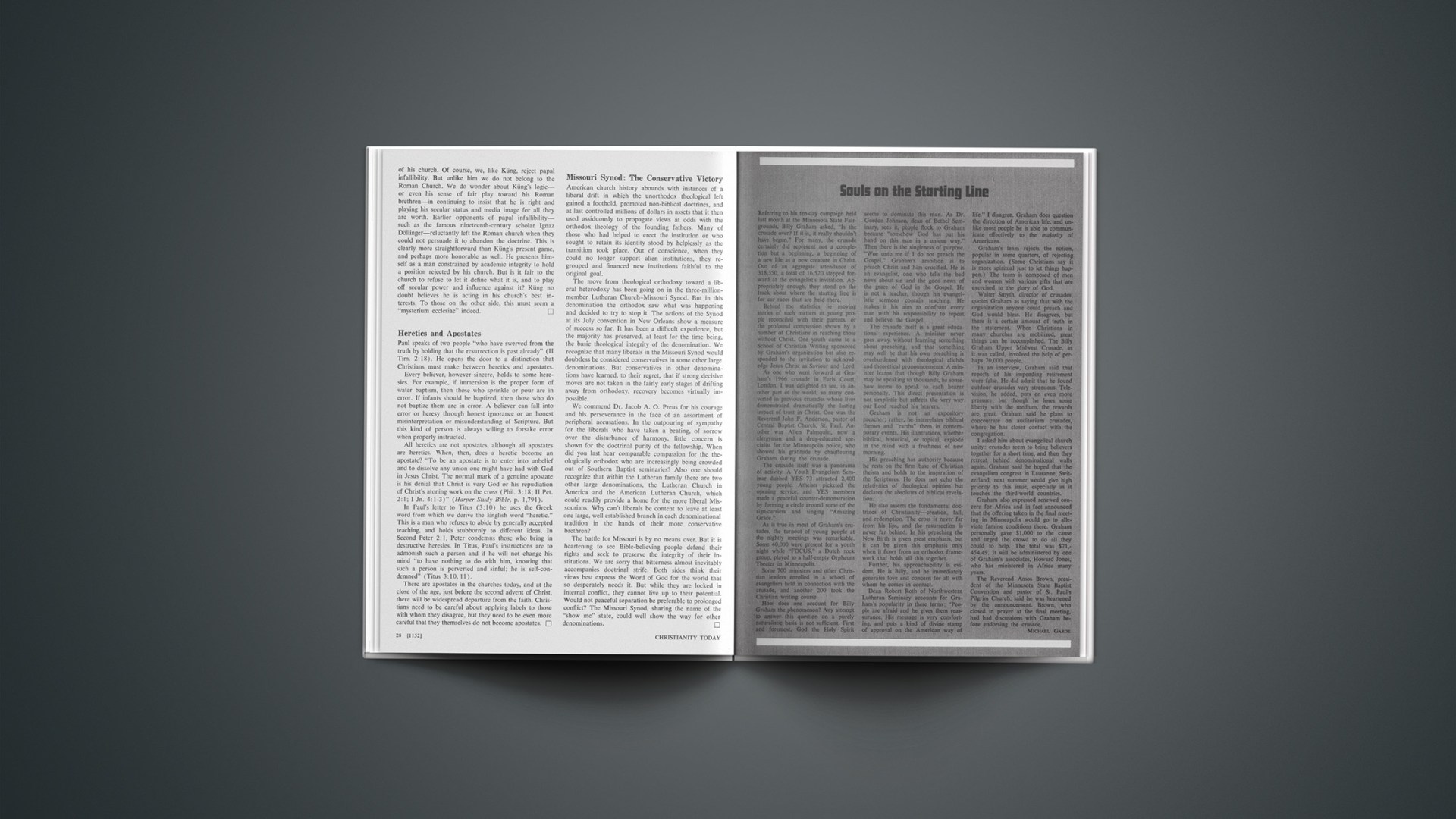 Referring to his ten-day campaign held last month at the Minnesota State Fairgrounds, Billy Graham asked, “Is the crusade over? If it is, it really shouldn’t have begun.” For many, the crusade certainly did represent not a completion but a beginning, a beginning of a new life as a new creature in Christ. Out of an aggregate attendance of 318,350, a total of 16,520 stepped forward at the evangelist’s invitation. Appropriately enough, they stood on the track about where the starting line is for car races that are held there.