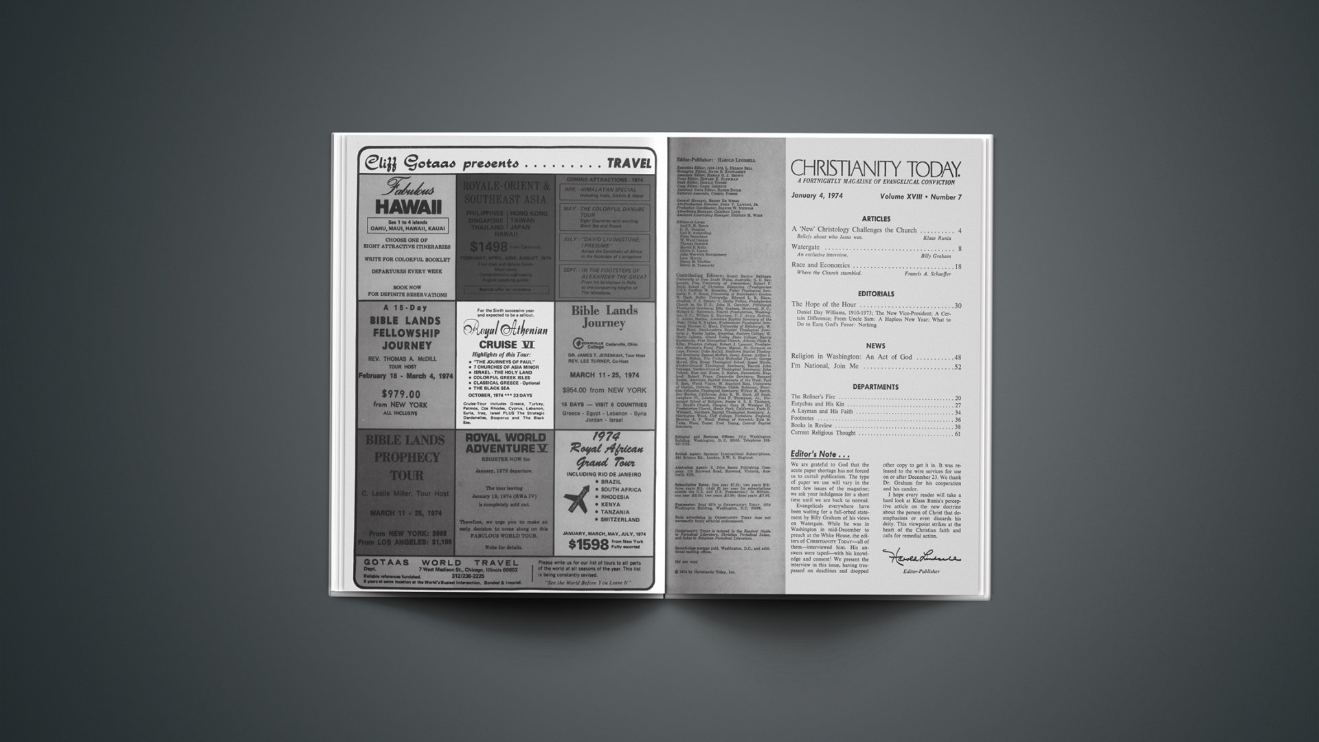 Evangelicals everywhere have been waiting for a full-orbed statement by Billy Graham of his views on Watergate. While he was in Washington in mid-December to preach at the White House, the editors of CHRISTIANITY TODAY—all of them—interviewed him. His answers were taped—with his knowledge and consent! We present the interview in this issue, having trespassed on deadlines and dropped other copy to get it in. It was released to the wire services for use on or after December 23. We thank Dr. Graham for his cooperation and his candor.