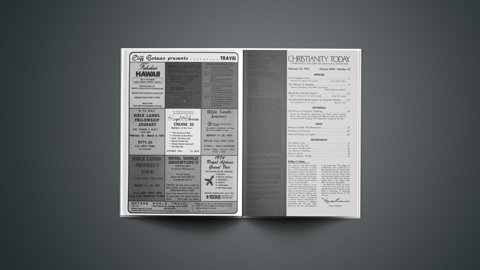 The next issue, March 1, is our book issue, with comprehensive surveys of the 1973 crop of religious books. It will also have a penetrating essay on Thomas Aquinas, who died 700 years ago this March. CHRISTIANITY TODAY is sponsoring a Christo Awards Competition to encourage excellence in religious advertising and will give three prizes for the best advertisements in the book issue. The judges are professionals, but I would like to get opinions from our readers also. A ballot box in that issue will enable you to tell me which three advertisements please you the most. And you can check your opinion against that of the judges when their decision is announced.