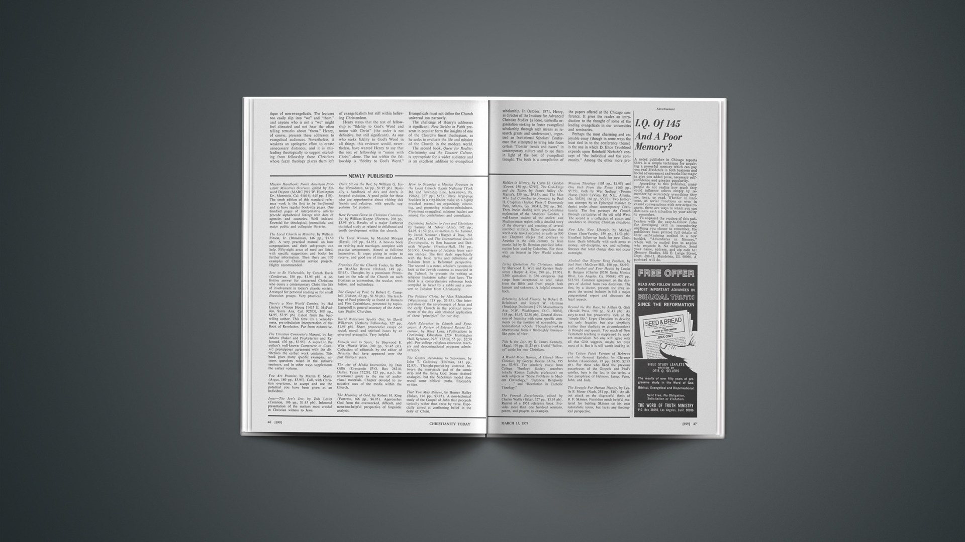 How to Organize a Mission Program in the Local Church (Louis Neibauer [York Rd. and Township Line, Jenkintown, Pa. 19046], 227 pp., $12). Three large-page booklets in a ring-binder make up a highly practical manual on organizing, educating, and promoting missions-mindedness. Prominent evangelical missions leaders are among the contributors and consultants.