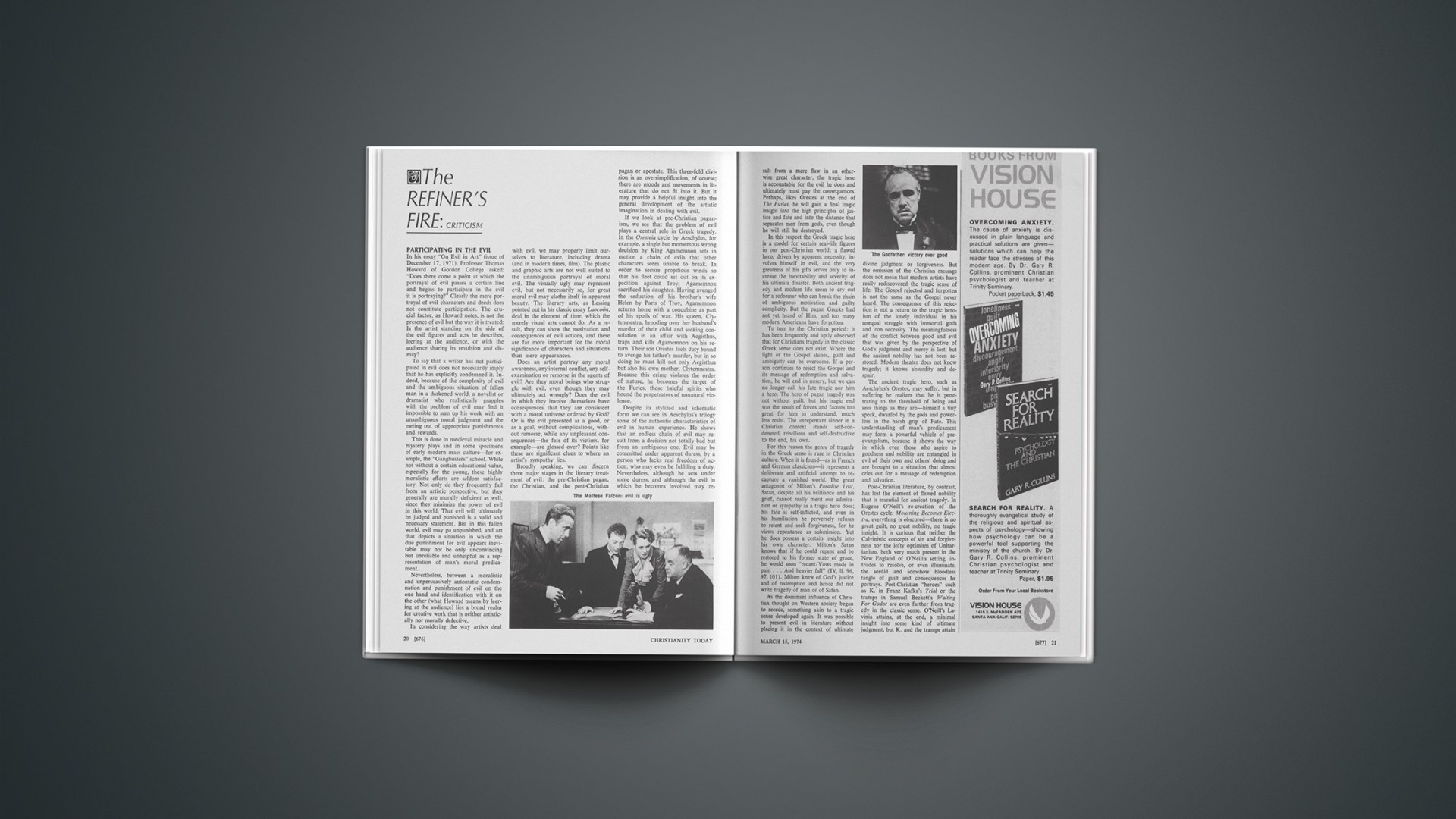 In his essay “On Evil in Art” (issue of December 17, 1971), Professor Thomas Howard of Gordon College asked: “Does there come a point at which the portrayal of evil passes a certain line and begins to participate in the evil it is portraying?” Clearly the mere portrayal of evil characters and deeds does not constitute participation. The crucial factor, as Howard notes, is not the presence of evil but the way it is treated: Is the artist standing on the side of the evil figures and acts he describes, leering at the audience, or with the audience sharing its revulsion and dismay?