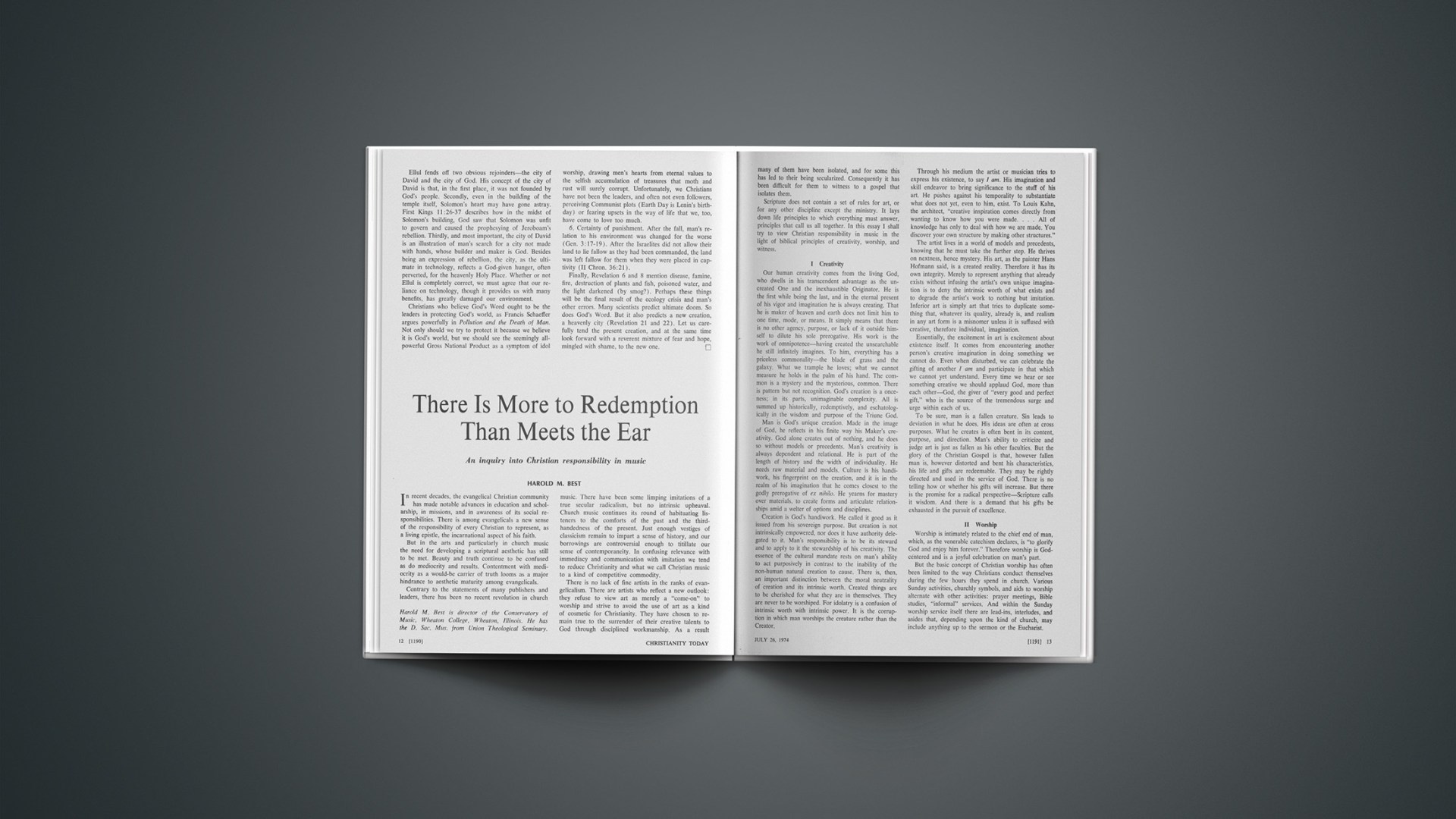 Scripture does not contain a set of rules for art, or for any other discipline except the ministry. It lays down life principles to which everything must answer, principles that call us all together. In this essay I shall try to view Christian responsibility in music in the light of biblical principles of creativity, worship, and witness.