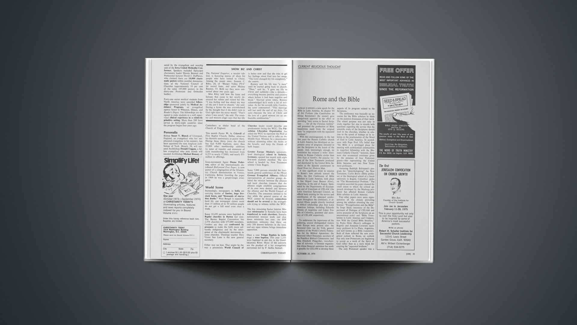 As evidence Armstrong pointed to the report for 1973: receipts soared to nearly $56 million; 7,000 new members were baptized; 3.6 million letters were processed at Pasadena alone; almost 38 million pieces of free literature were mailed out; and from June (when toll-free service was instituted) through December, 50,000 telephone calls (90 per cent of them from “new” people) lighted up the Pasadena switchboard. Personal-appearance campaigns, paid advertising in mass-circulation magazines, and the broadcast have produced a backlog of “7,000 new prospective members” as of June of this year awaiting ministerial visits. Recently announced strategy calls for a switch from daily to weekly TV but the extension of both TV and daily radio broadcasts to dozens of additional cities. Thus the downward trend in media outreach (from 384 to 311 outlets between January, 1973, and spring, 1974) is to be reversed.1U. S. television coverage grew from 47 to 88 stations during this interval; Canadian, from 28 to 33. Meanwhile, U. S. radio fell from 200 to 98 stations; Canadian climbed from 39 to 59. Of greater significance is the fact that overseas outlets over this period diminished by more than half, from 70 to 33. European coverage is now limited to one lone French broadcast.