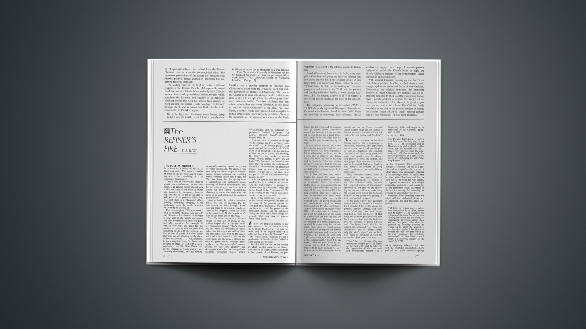 T. S. Eliot has been dead only a decade, but already his words seem oracular in their clairvoyant relevance to our situation. Indeed, this oracular quality about his pronouncements irritated his critics even while he was still alive. Of the many studies of Eliot that have appeared, none that I know of deals so massively with Eliot’s whole vision, particularly with respect to the alarming issues of public imagination and morals in our epoch, as Russell Kirk’s Eliot and His Age, published at the start of our decade (Random House, 1971). We might not do wrong to pull it off the shelf, here in the middle as it were, and see what we can see.