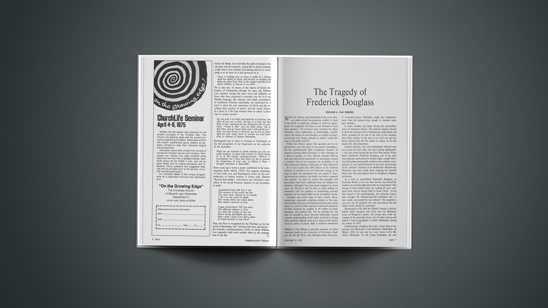 Another mistake—one that immediately affected only one person but had wider and more lasting implications—was also made during the pre-Civil War period. When black abolitionist Frederick Douglass, one of the era’s most dynamic spokesmen for human rights, sought Christian fellowship among both northern and southern evangelicals, he was rejected because of his color and because of his “political” activities as an abolitionist. Modern-day Christians can learn much from studying the harmful effects that this proscription had on Douglass’s religious profession.