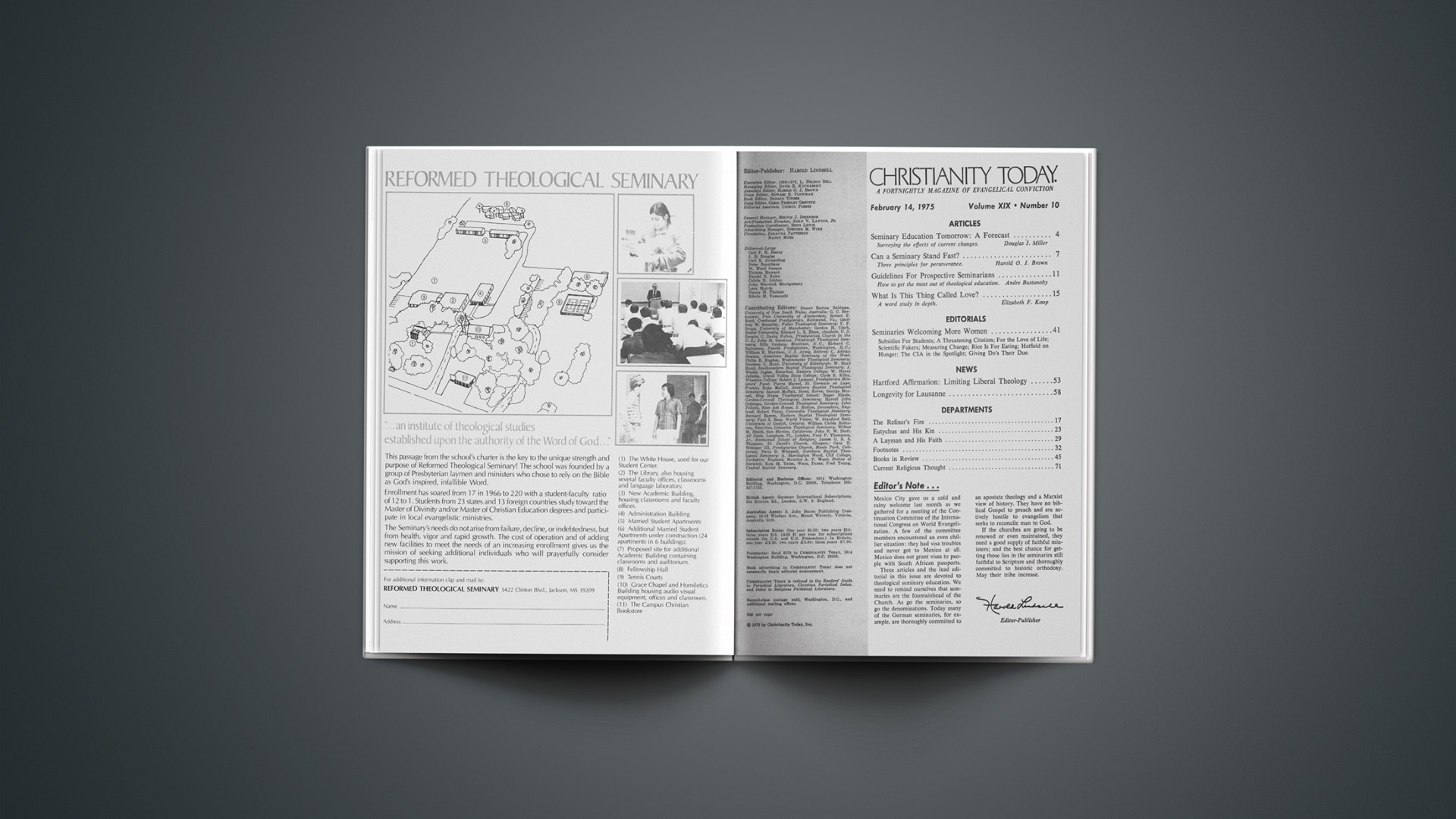 Three articles and the lead editorial in this issue are devoted to theological seminary education. We need to remind ourselves that seminaries are the fountainhead of the Church. As go the seminaries, so go the denominations. Today many of the German seminaries, for example, are thoroughly committed to an apostate theology and a Marxist view of history. They have no biblical Gospel to preach and are actively hostile to evangelism that seeks to reconcile man to God.